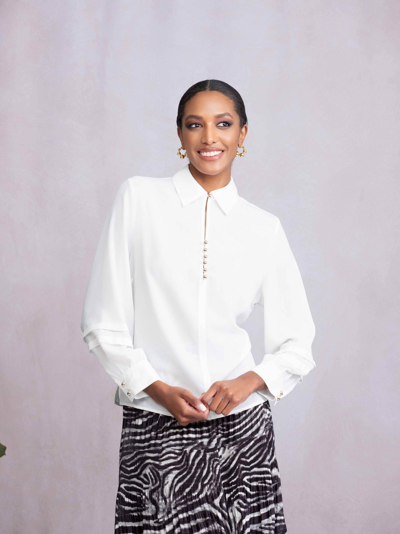Add refined elegance to your wardrobe with our Button-Detail Blouse, a versatile piece designed for both work and evening wear. Featuring a sleek point collar, delicate front button accents, and a hidden placket for a polished finish, this blouse is crafted from a fluid, lightweight fabric that drapes beautifully. The long sleeves with gathered cuffs and gold-tone button details bring a touch of sophistication, while the relaxed fit ensures all-day comfort. Available in crisp white and vibrant purple, this blouse pairs effortlessly with tailored trousers, skirts, or your favorite jeans for a chic, elevated look.