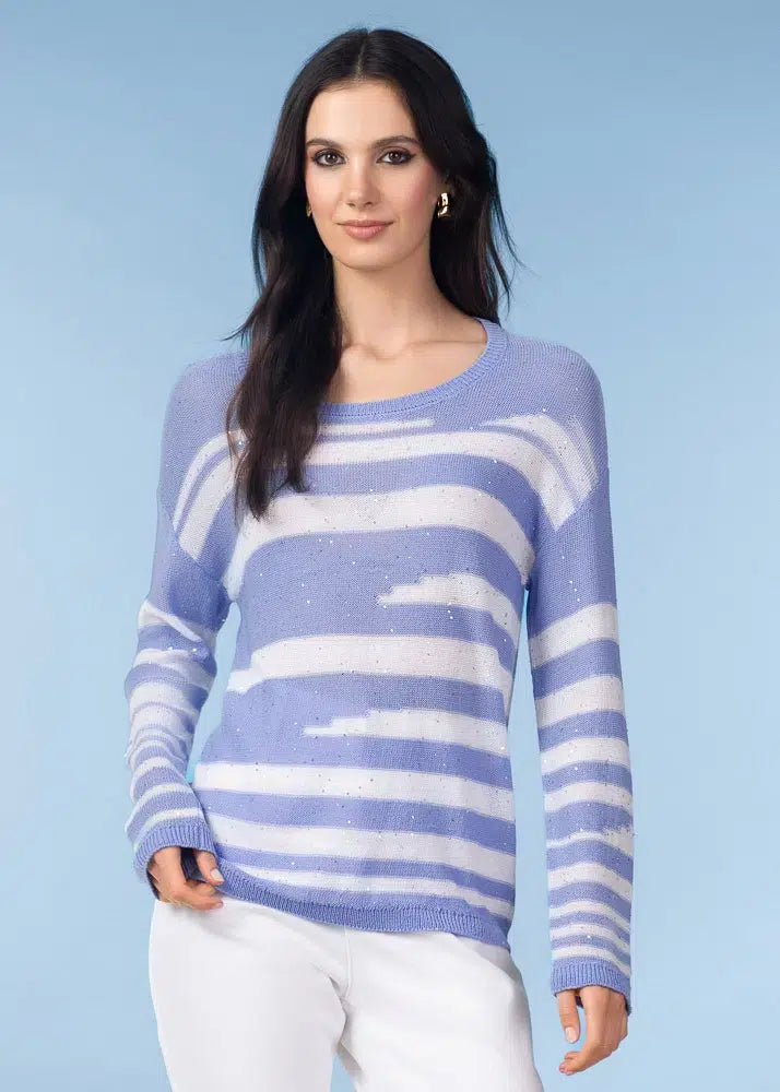 Soft Stripe Knit sweater with a modern horizontal stripe pattern and relaxed fit. The lightweight, fluid fabric drapes beautifully and works perfectly for layering or solo wear. Featuring a classic crew neckline and subtle texture that adds dimension without compromising the clean, elevated aesthetic. Versatile enough to pair with denim or trousers for effortless, polished style.