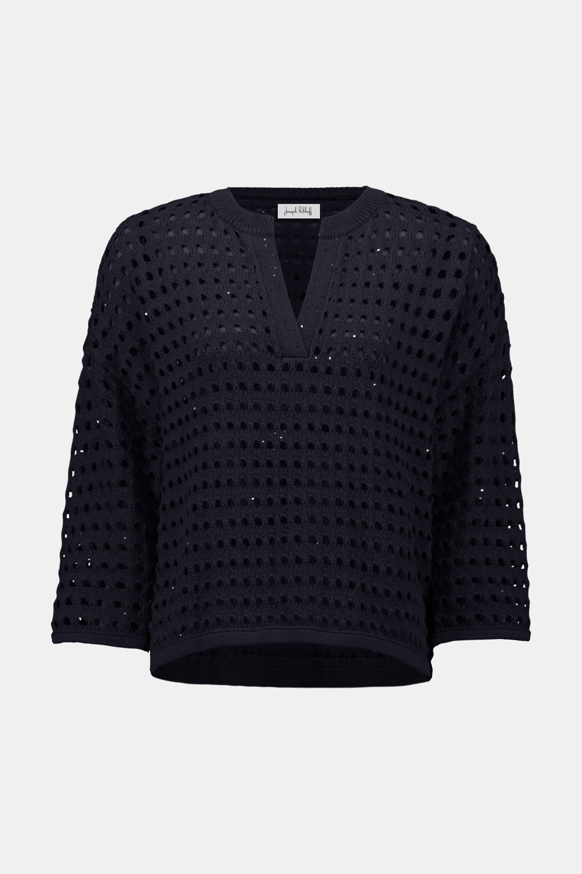 Crafted from a cotton blend and sequins yarn, this solid open stitch sweater features a notched V-necklineline and three-quarter sleeves. The boxy fit adds a relaxed, casual feel to any wardrobe.