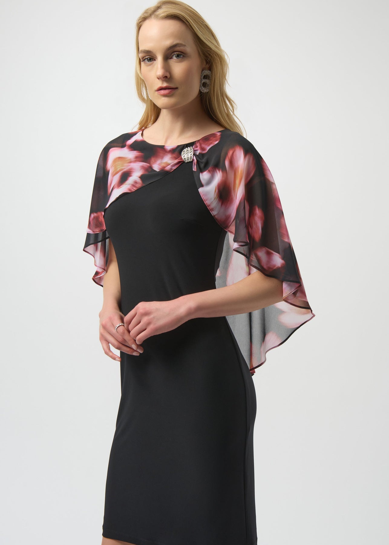 This stunning silky knit dress features a sleek sheath silhouette, enhanced by a lively floral print showcased through a flowing chiffon overlay cape. The boat neckline is accented with a sparkling rhinestone detail, adding a touch of elegant glamour to the look.