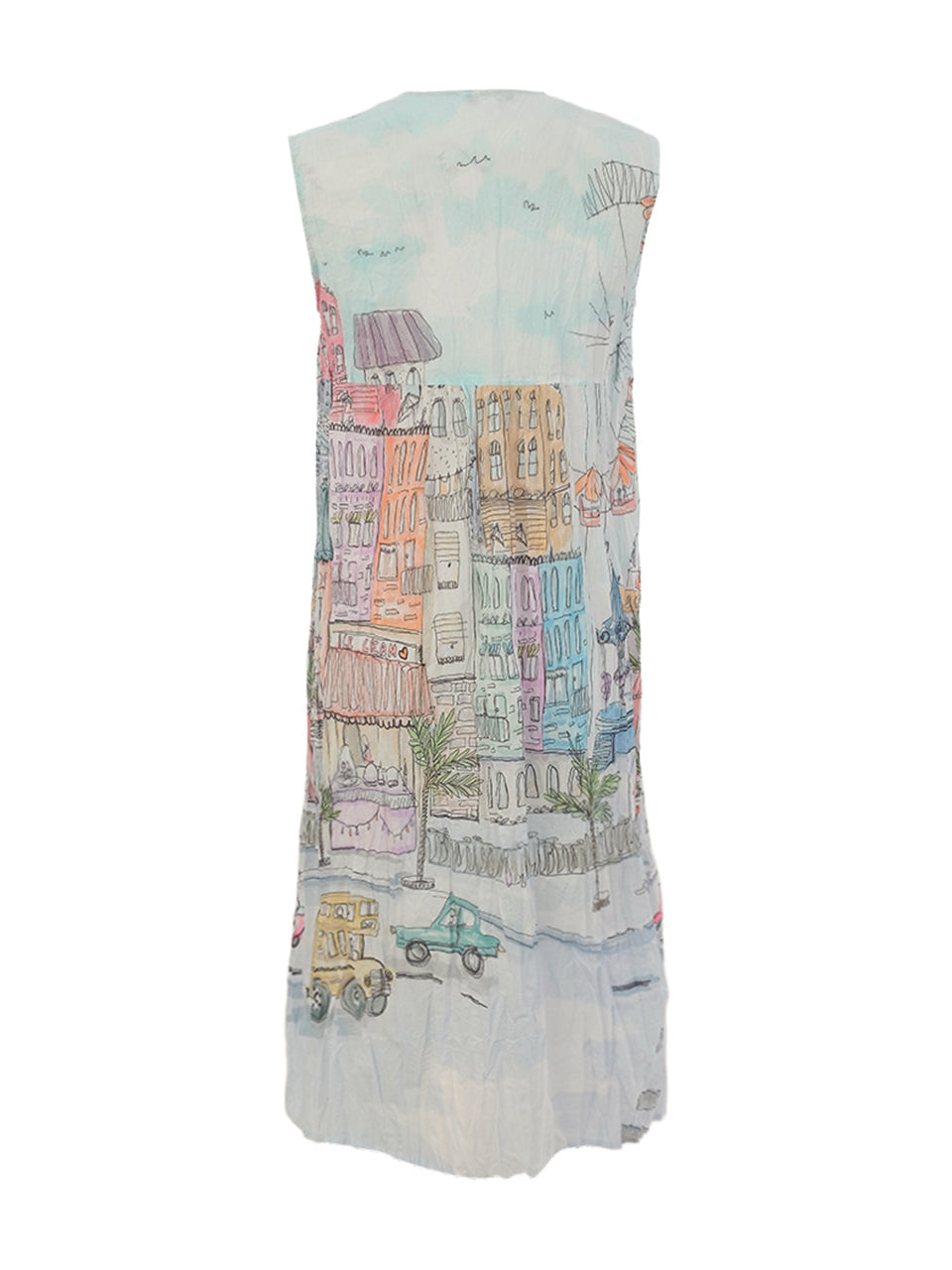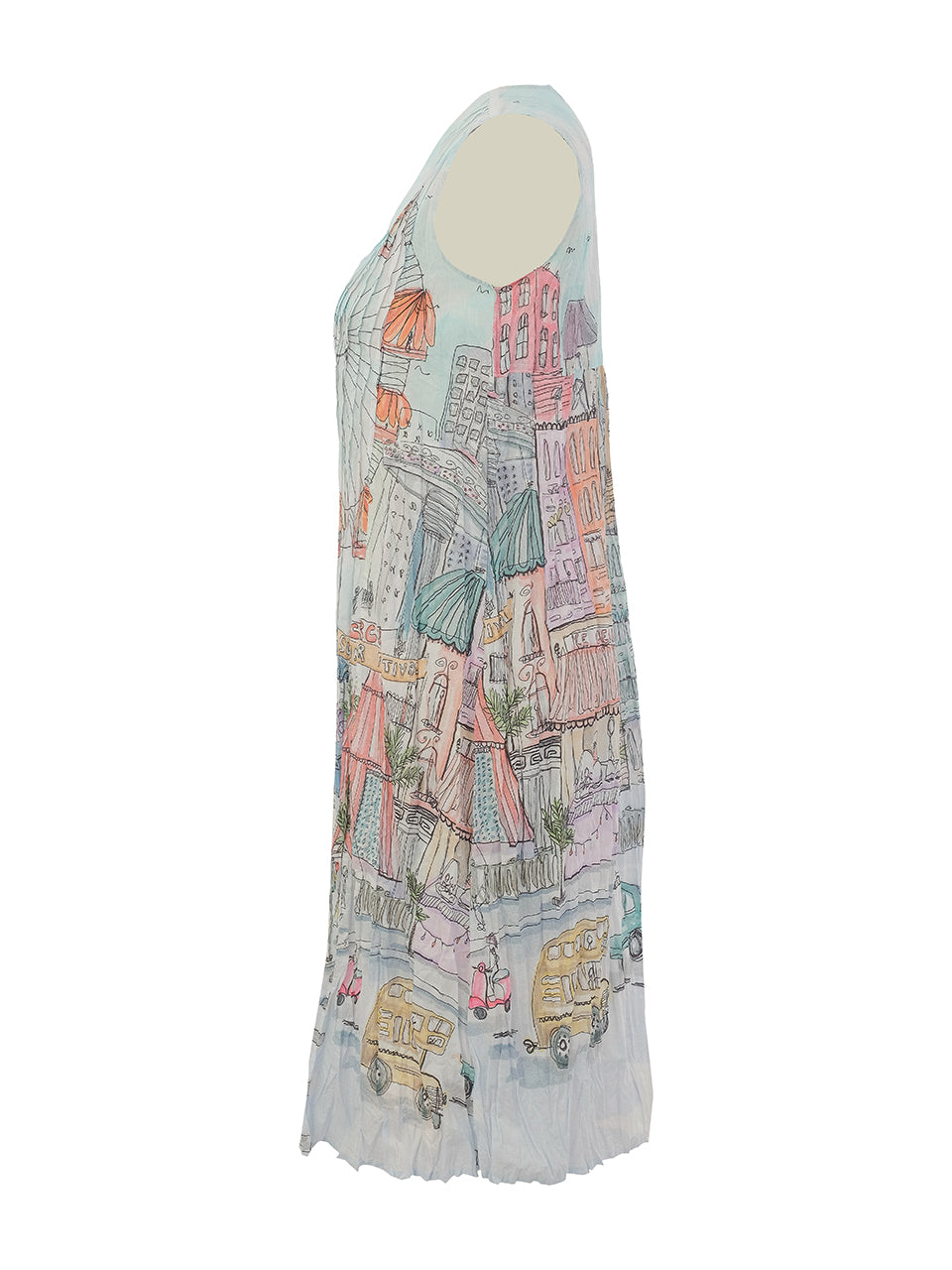 A flowy sleeveless dress featuring a vibrant city-inspired print that brings movement and charm to every step. Designed with soft pleating and a relaxed silhouette, it offers an easy, flattering fit with all-day comfort. Lightweight and effortless, this piece adds a playful, artistic touch to your wardrobe—perfect for warm days and standout everyday styling.