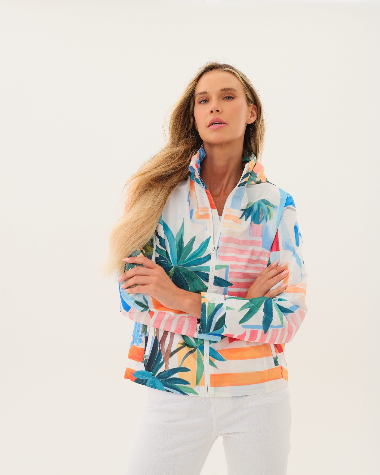 This lightweight raincoat features a vibrant, art-inspired print that blends tropical leaves with soft stripes for a fresh, modern look. Designed with a stand collar, long sleeves, and a front zip closure, it offers practical coverage with a polished feel. The water-resistant fabric and easy, flattering fit make it perfect for layering on rainy days while keeping your style effortlessly