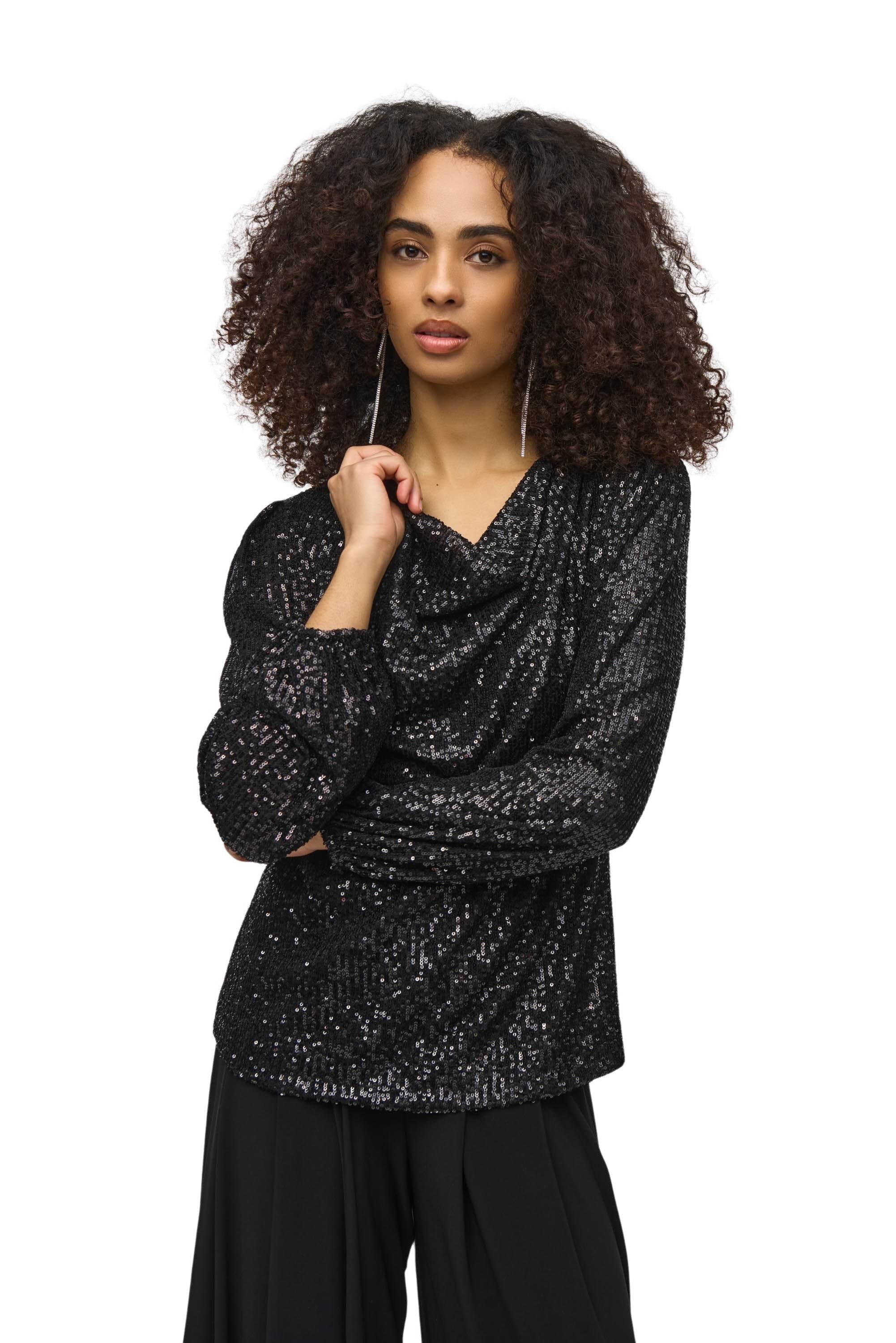 Effortlessly exuding fabulous style, this sequined top effortlessly blends classic elegance with sophisticated texture through its draped cowl neckline. It makes for a stunning addition to any outfit, be it with pants or a skirt.
