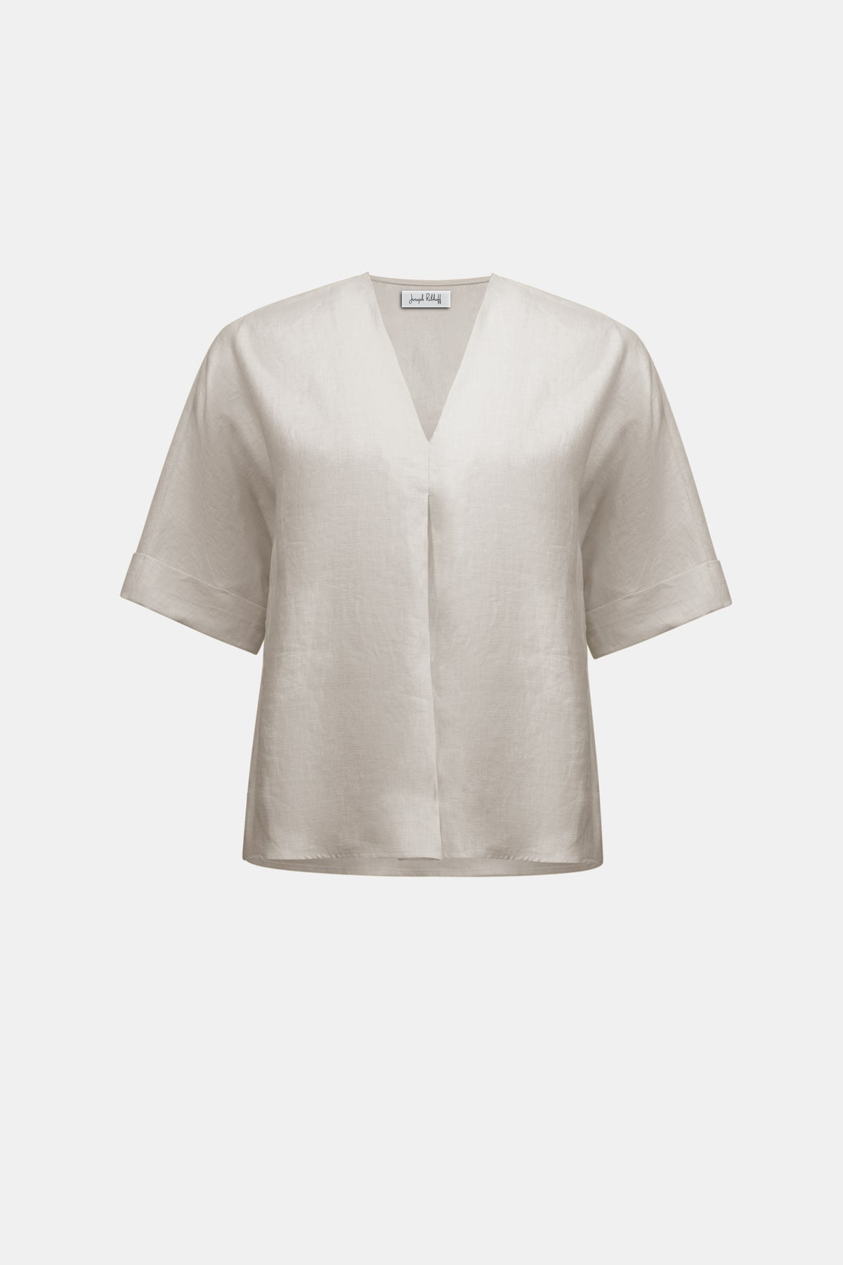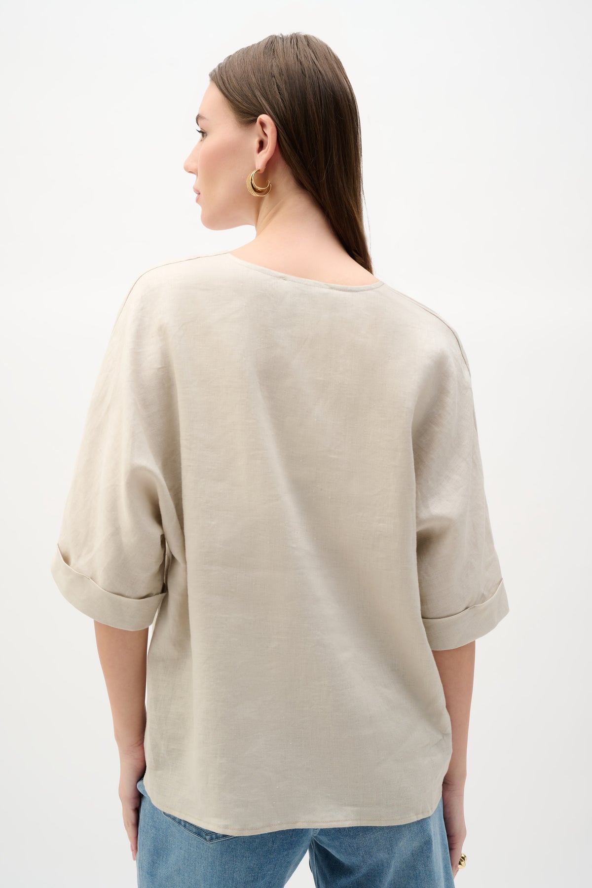 Made from 100% linen, this top blends natural texture with a hint of sheen. It features a V-notch neckline with a soft pleat, and is finished with three-quarter dolman sleeves and cuffs for an effortless, polished look.