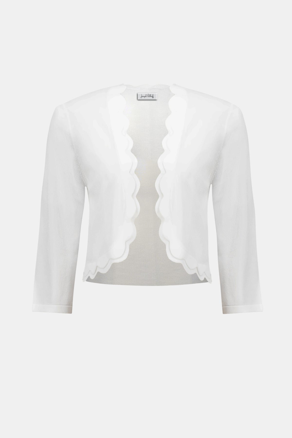 This lightweight bolero cardigan in a viscose blend features refined details, including three-quarter sleeves and scalloped trim. Its fitted silhouette adds a polished touch to both casual and dressy looks.