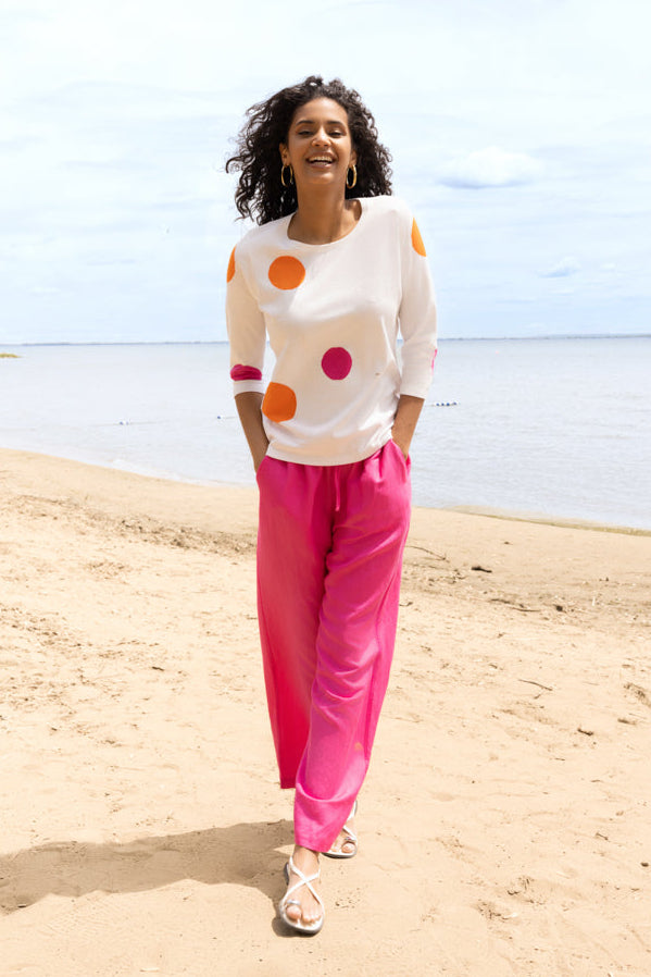 Pull doux et ludique orné de pois audacieux qui rehausse instantanément n'importe quelle tenue. Sa coupe décontractée et ses manches 3/4 le rendent idéal à superposer ou à porter seul par temps de mi-saison. À associer avec un jean pour un style décontracté ou un pantalon coloré pour un look affirmé.