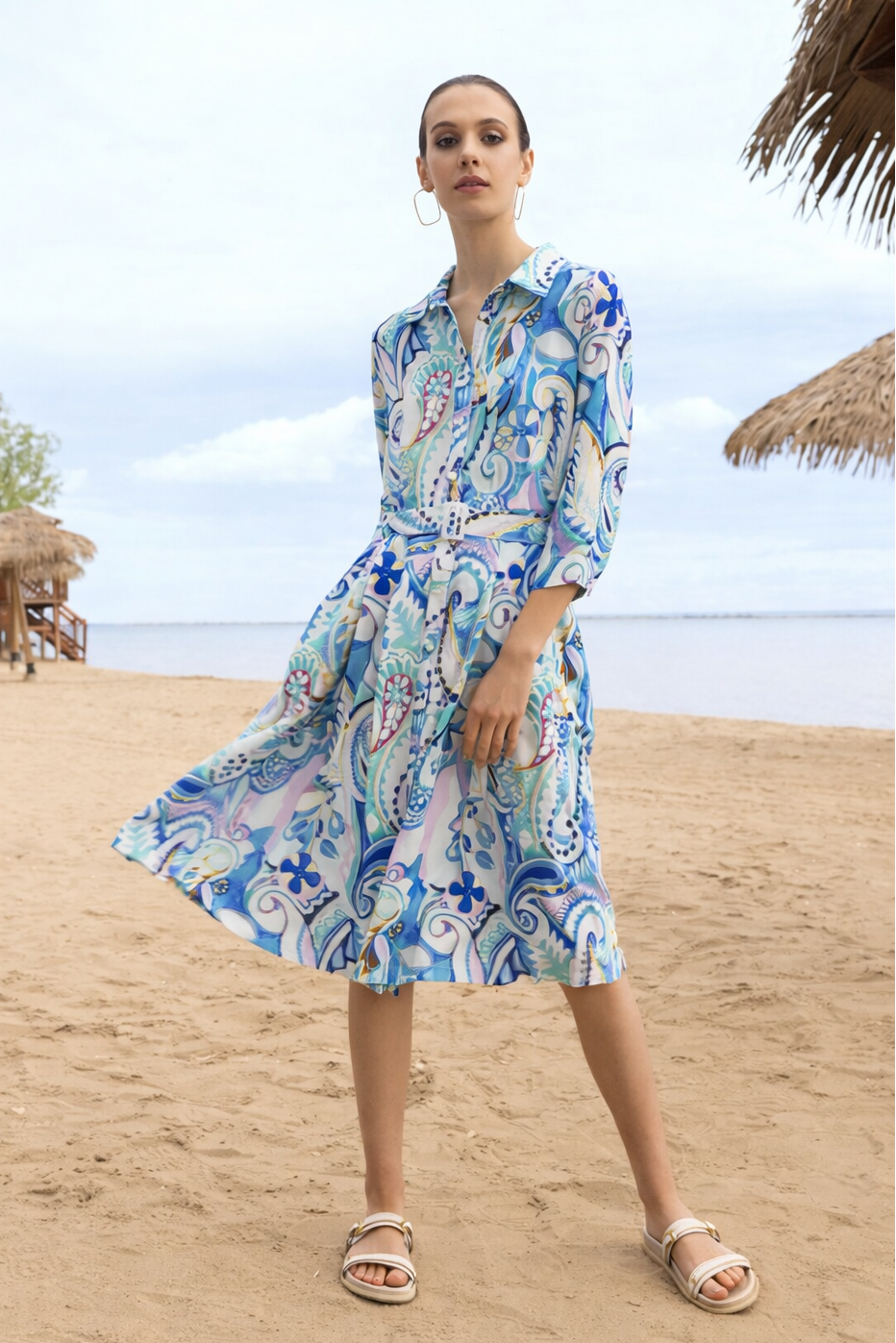 Robe sans manches élégante à motif cachemire, confectionnée dans un tissu fluide qui épouse vos mouvements. Coupe classique de robe-chemise avec boutonnage sur le devant, col et ceinture ajustable pour une silhouette flatteuse qui souligne la taille. Sa longueur midi offre une couvrance gracieuse, idéale pour les beaux jours, les voyages ou les vacances.