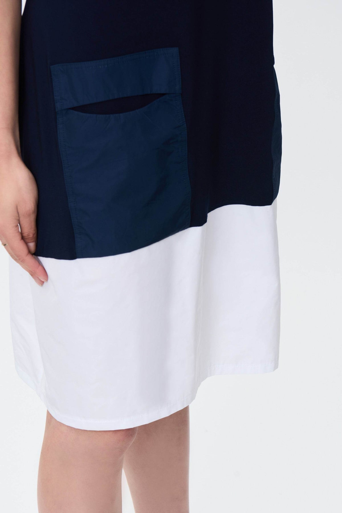 Cette robe, au tricot soyeux et à la jupe à mémoire de forme originale, est un véritable bijou de sophistication. Dotée de manches courtes et de grandes poches plaquées sur le devant, cette robe mi-longue allie praticité et modernité. Son design color-block non doublé lui confère une élégance intemporelle.