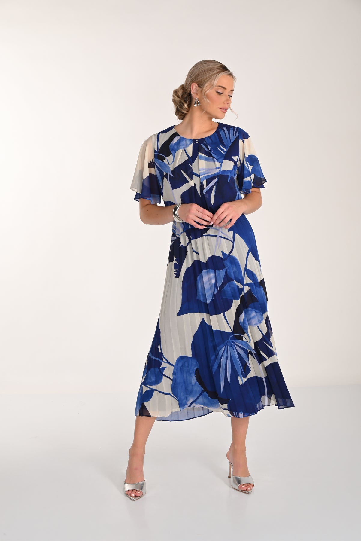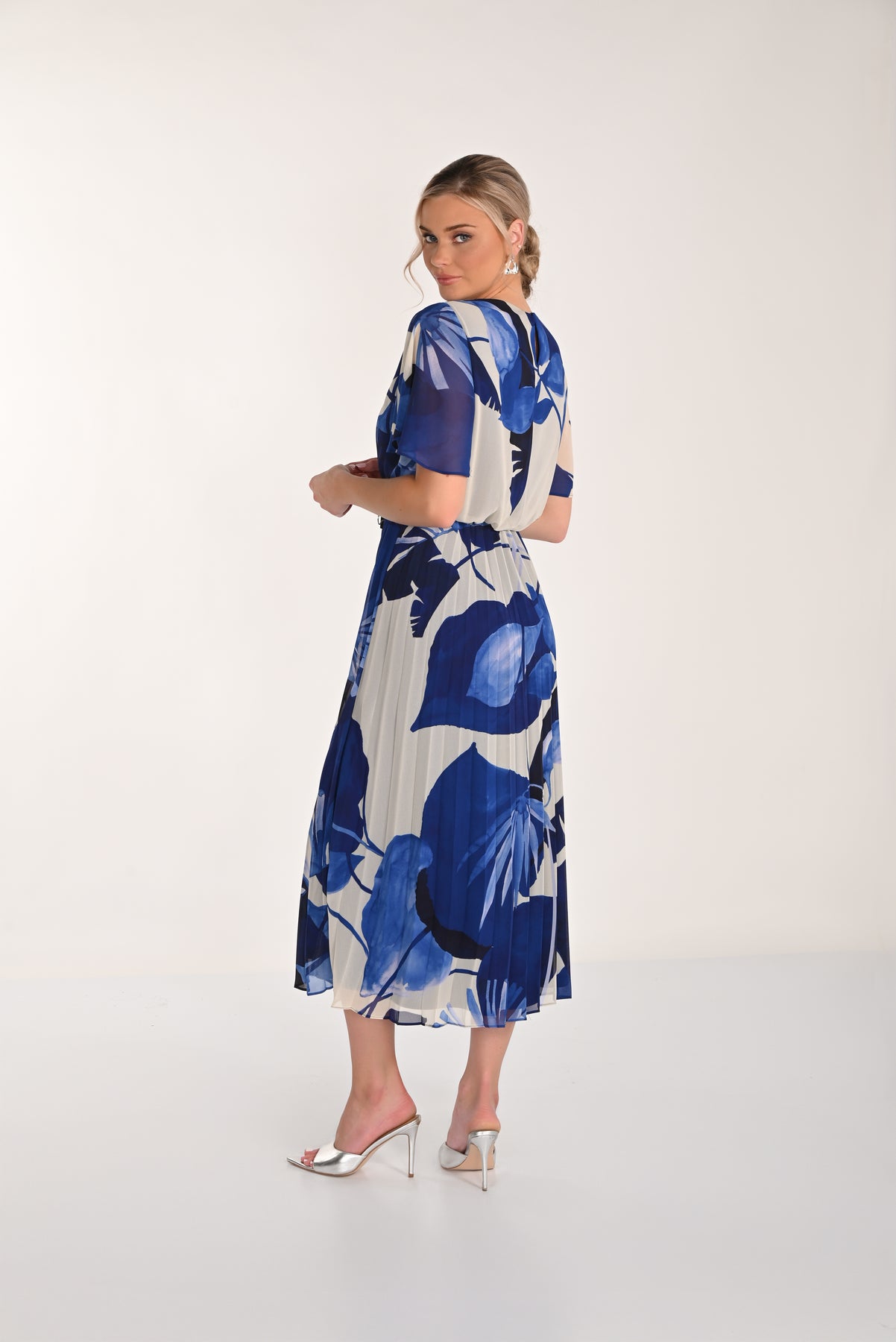 The Bloom Pleated Midi Dress combines style and comfort in one stunning piece. Its abstract floral print in rich blues pairs beautifully with delicate pleating for a graceful drape. Soft flutter sleeves and a flattering midi length make it perfect for weddings, special occasions, or any event where you want to feel confident and elegant.