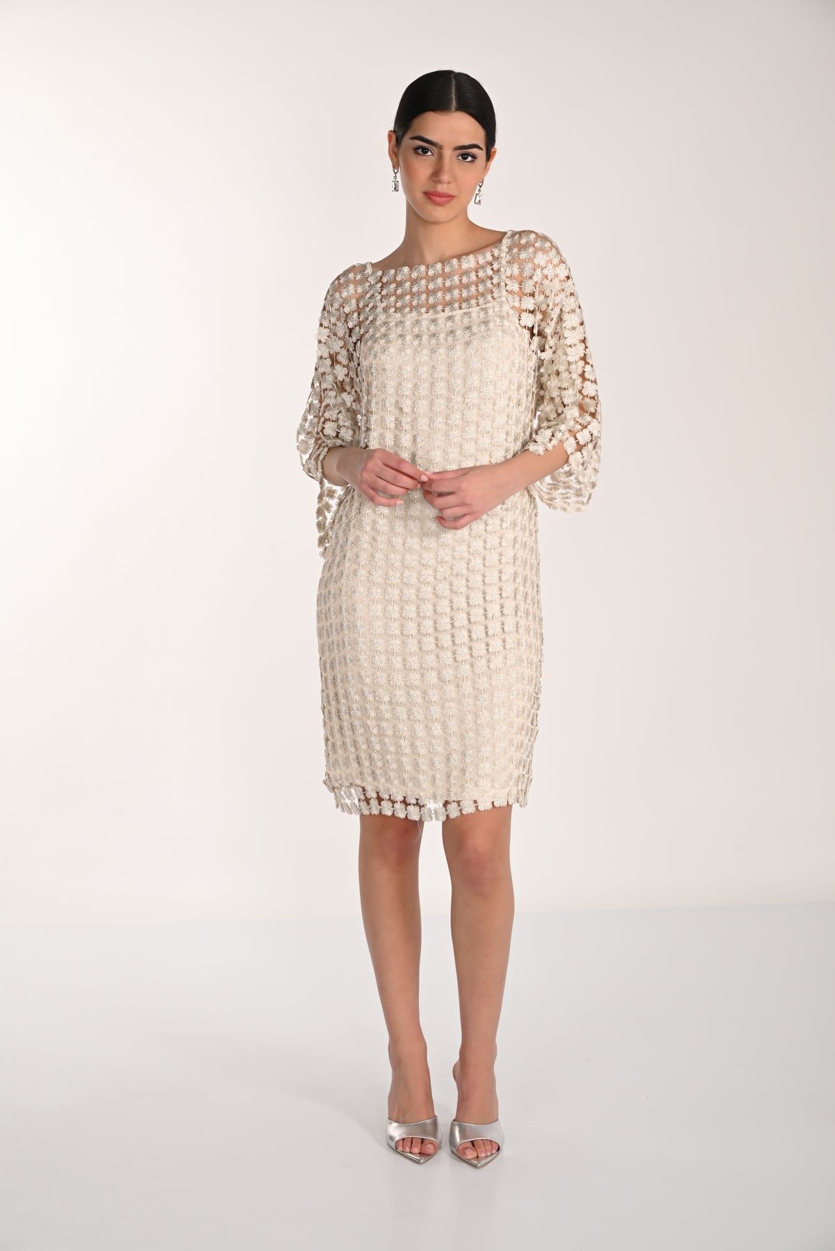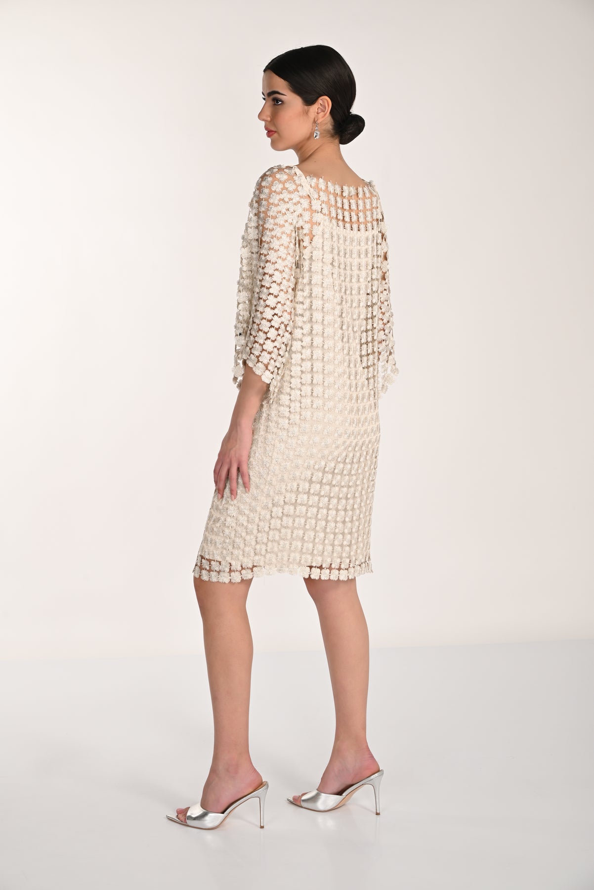 Soft champagne lace with an elegant illusion neckline and three-quarter sleeves creates a refined, romantic look. The relaxed shift silhouette flatters while keeping you comfortable, making it ideal for weddings, celebrations, or evening events. Knee-length and effortlessly polished.