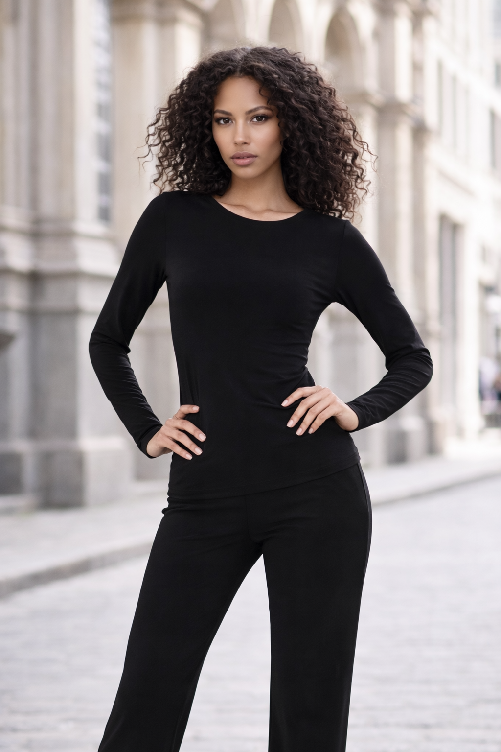Un haut sophistiqué à manches longues, orné d'un devant lisse et d'un dos en résille transparente rehaussé de détails scintillants. Sa coupe ajustée et son encolure bateau classique lui confèrent une élégance intemporelle, tandis que le dos original apporte une touche de modernité. À porter aussi bien avec un pantalon tailleur qu'avec une robe de soirée.