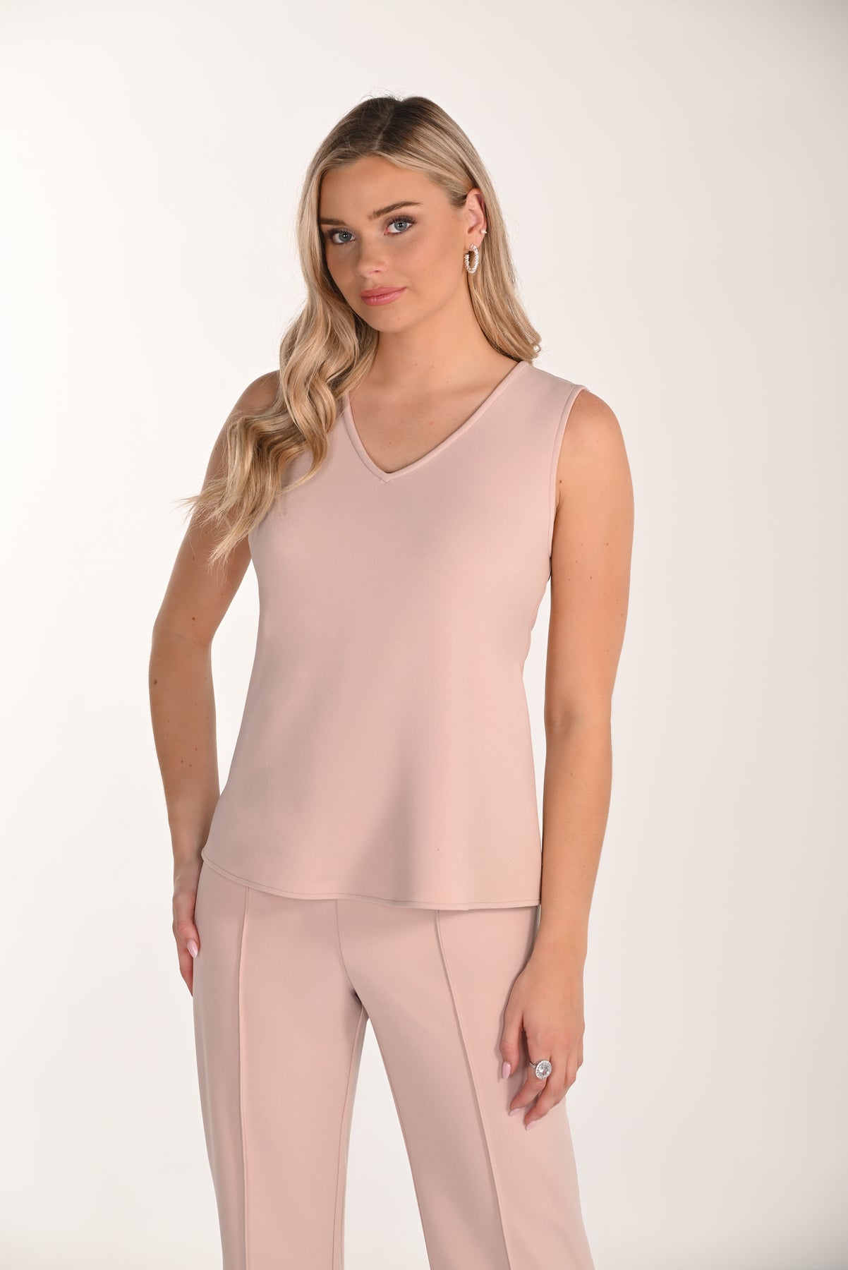 Un débardeur à col V polyvalent qui s'accorde avec toutes les garde-robes. Son tissu lisse et extensible offre un joli tombé tout en conservant sa forme, que vous le portiez seul ou sous votre veste préférée. Flatteur, confortable et toujours élégant, ce basique se marie avec tout, du pantalon tailleur au jean.