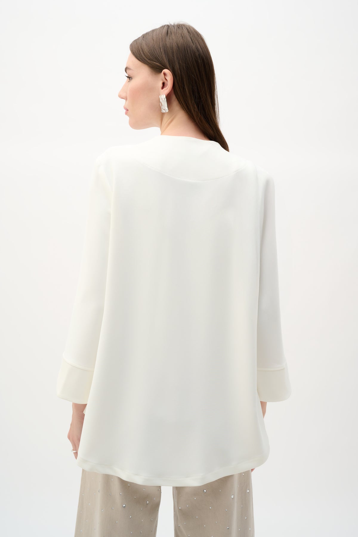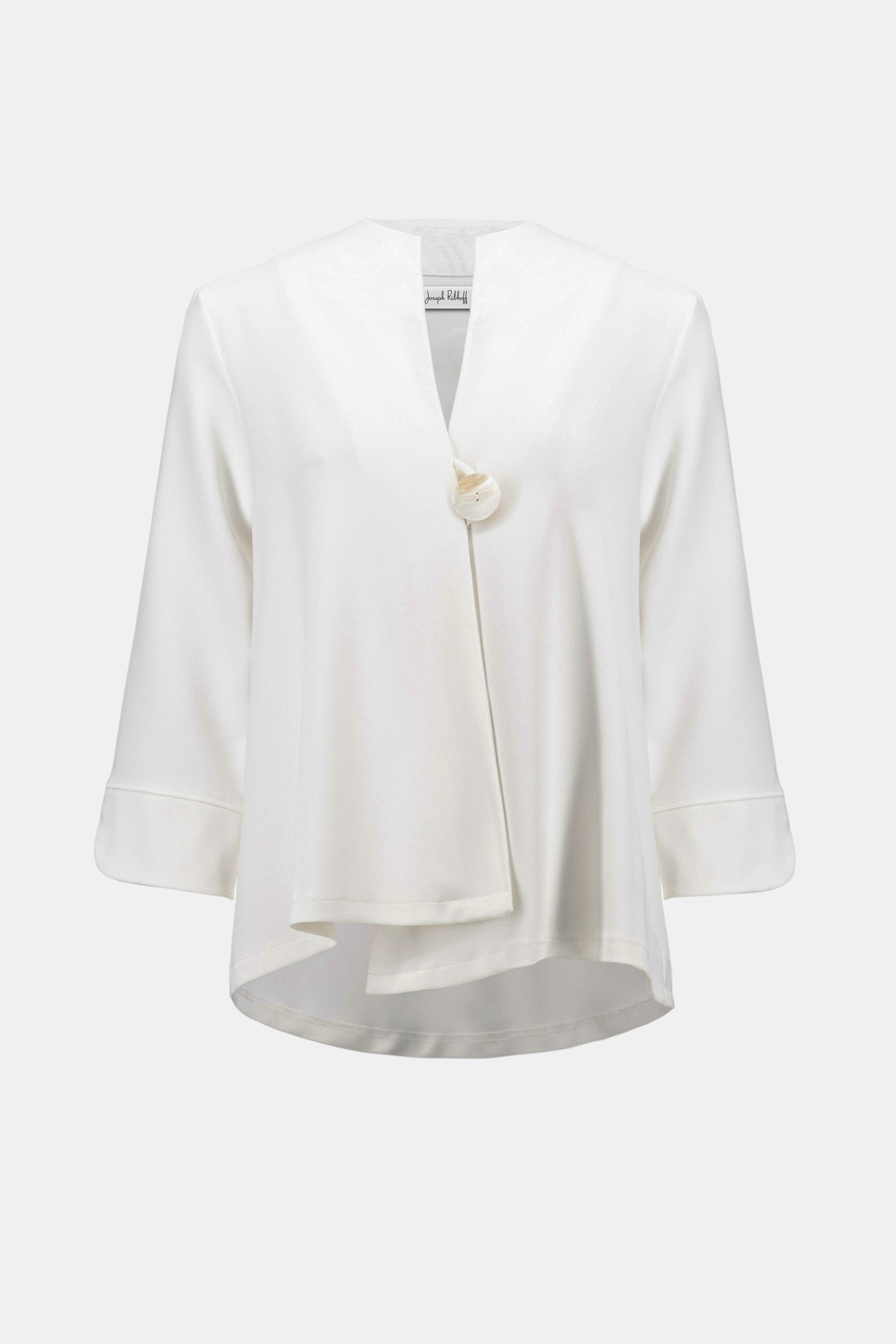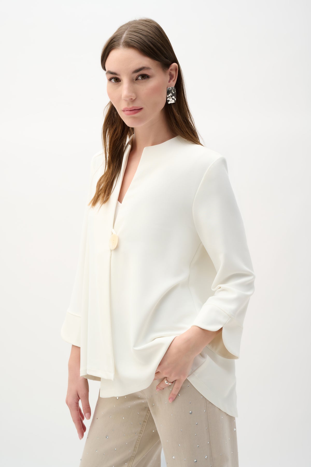 Cette veste trapèze minimaliste audacieuse attire tous les regards grâce à un unique bouton qui souligne sa silhouette épurée. Confectionnée en sergé tissé impeccable, sa coupe non doublée offre une esthétique raffinée et naturelle sans compromettre la structure. Les manches trois-quarts assurent un équilibre parfait entre maintien et liberté de mouvement, faisant de cette pièce un incontournable pour celles qui aiment l'élégance discrète.