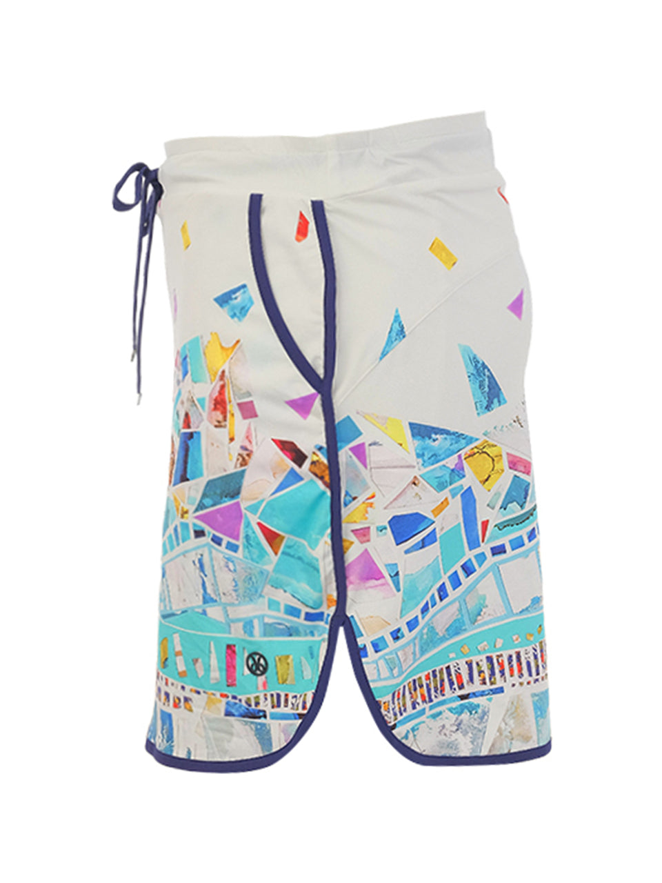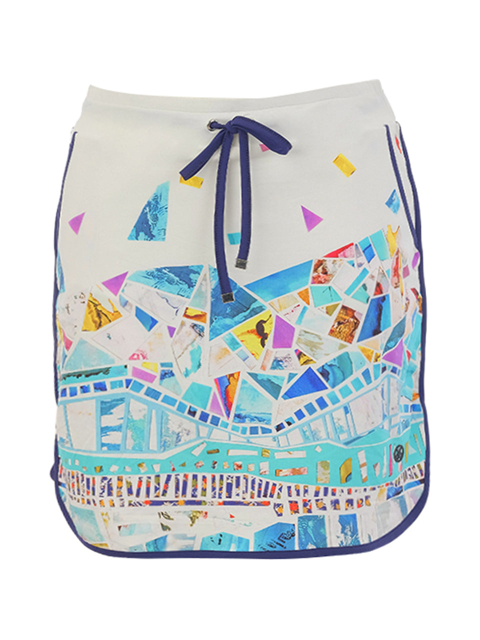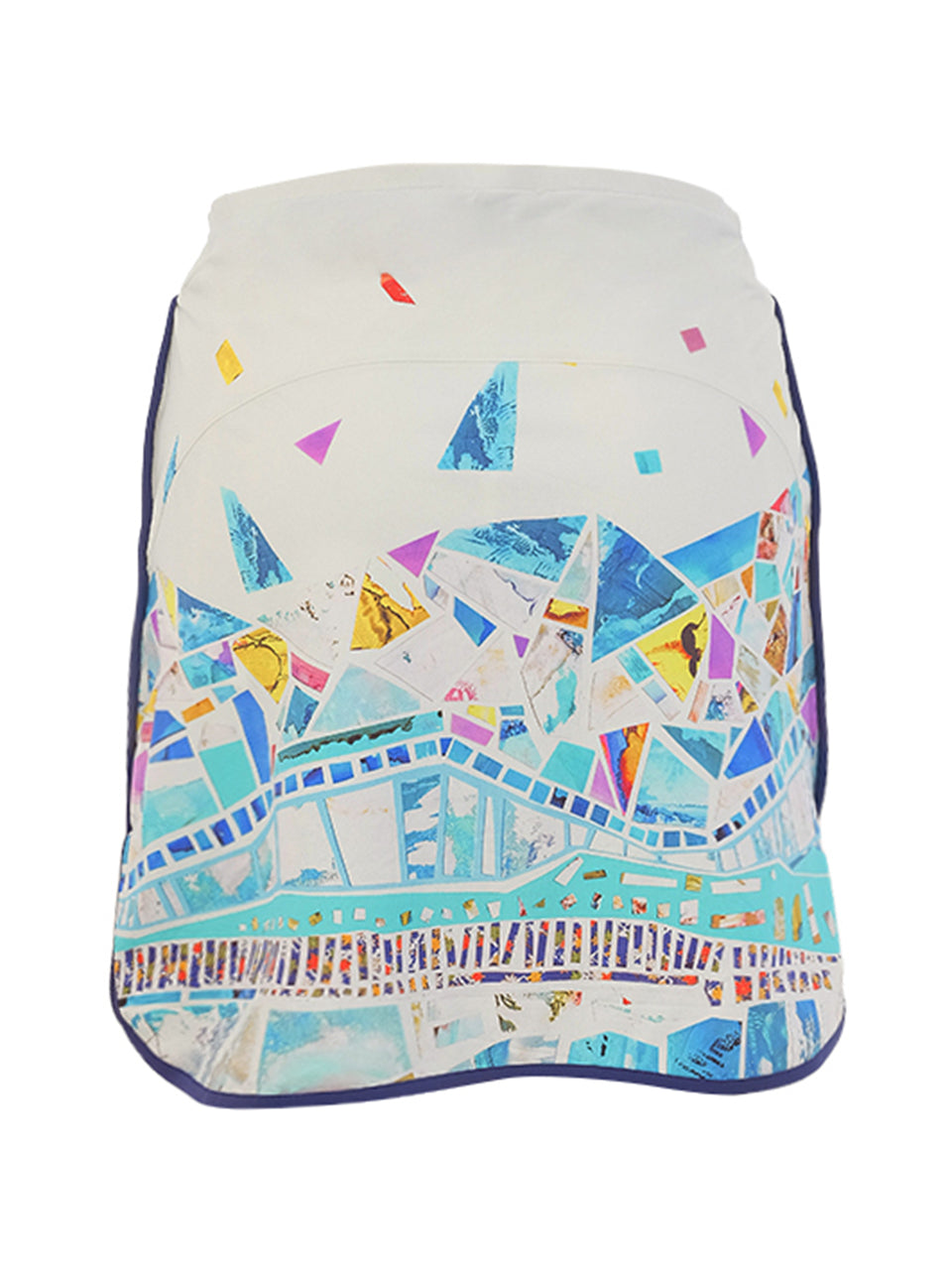 A vibrant pull-on skort inspired by the beauty of sea glass and colorful mosaic art. Featuring a lively collage of aqua, turquoise, coral, yellow, and soft pink fragments, the design creates a playful stained-glass effect against a fresh ivory background. Finished with sporty navy trim and an adjustable drawstring waist, this skort blends comfort, movement, and artistic styleâperfect for the golf course or sunny resort days. đ