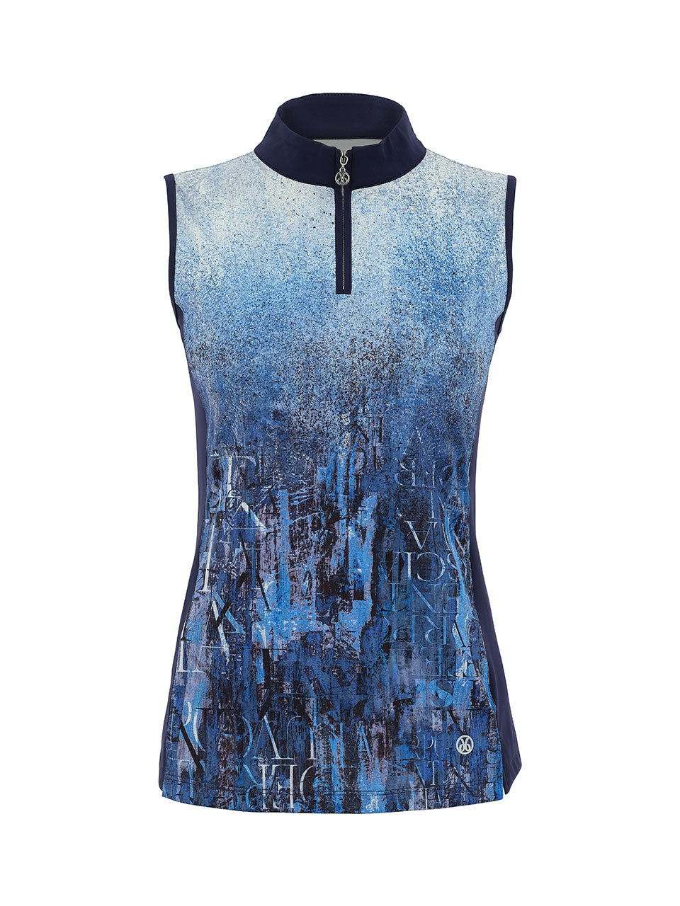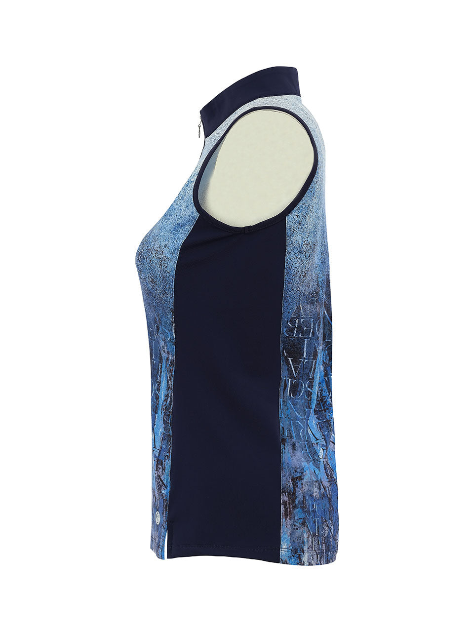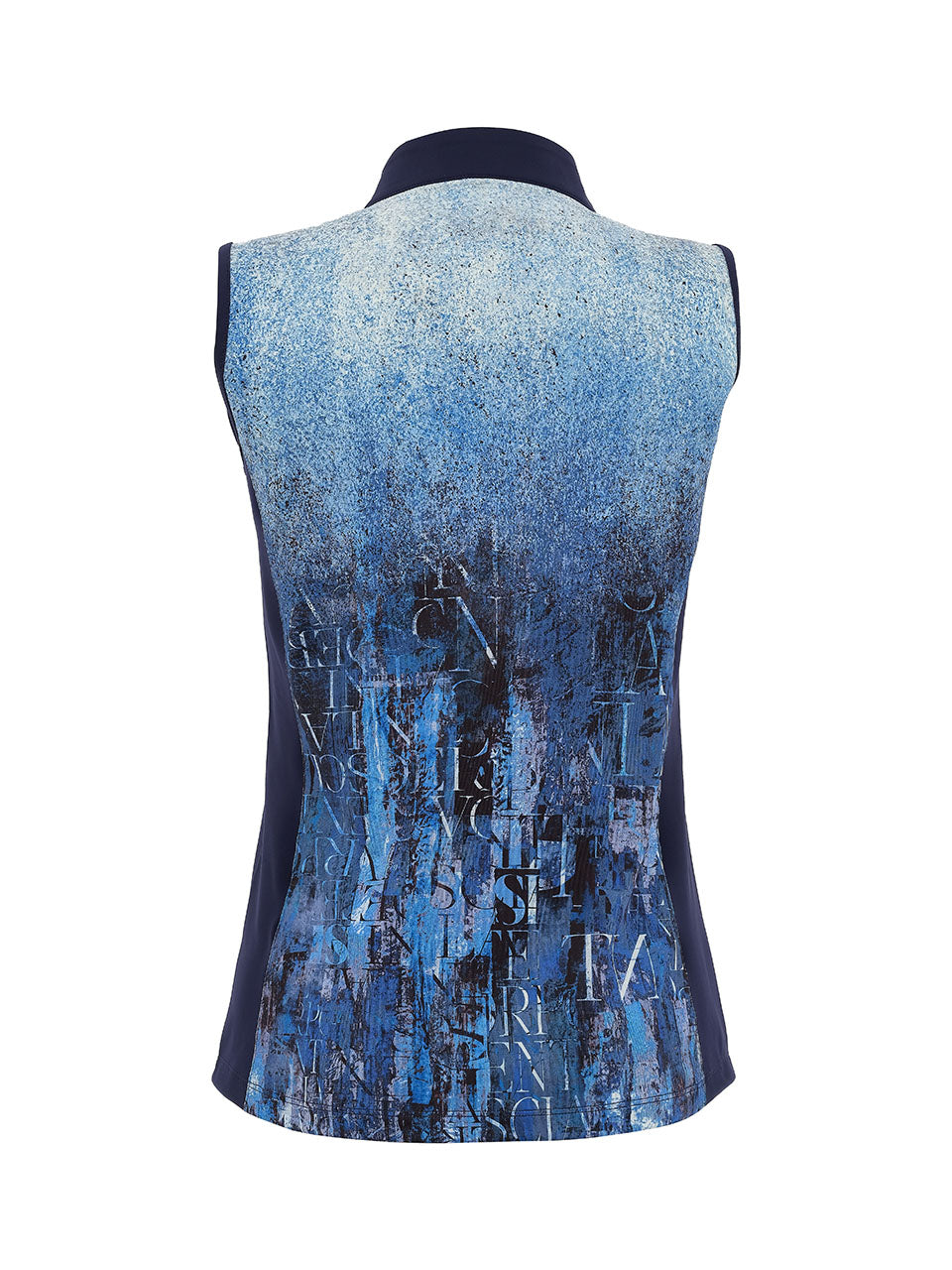 A sleek sleeveless top featuring a modern stand collar with a half-zip neckline for a sporty touch. The abstract blue print blends layered textures and subtle lettering for an artistic, urban-inspired look. Designed with contrasting side panels for a flattering silhouette, this lightweight top offers effortless comfort and contemporary style—perfect for pairing with jeans, skirts, or active pieces for a polished casual outfit.