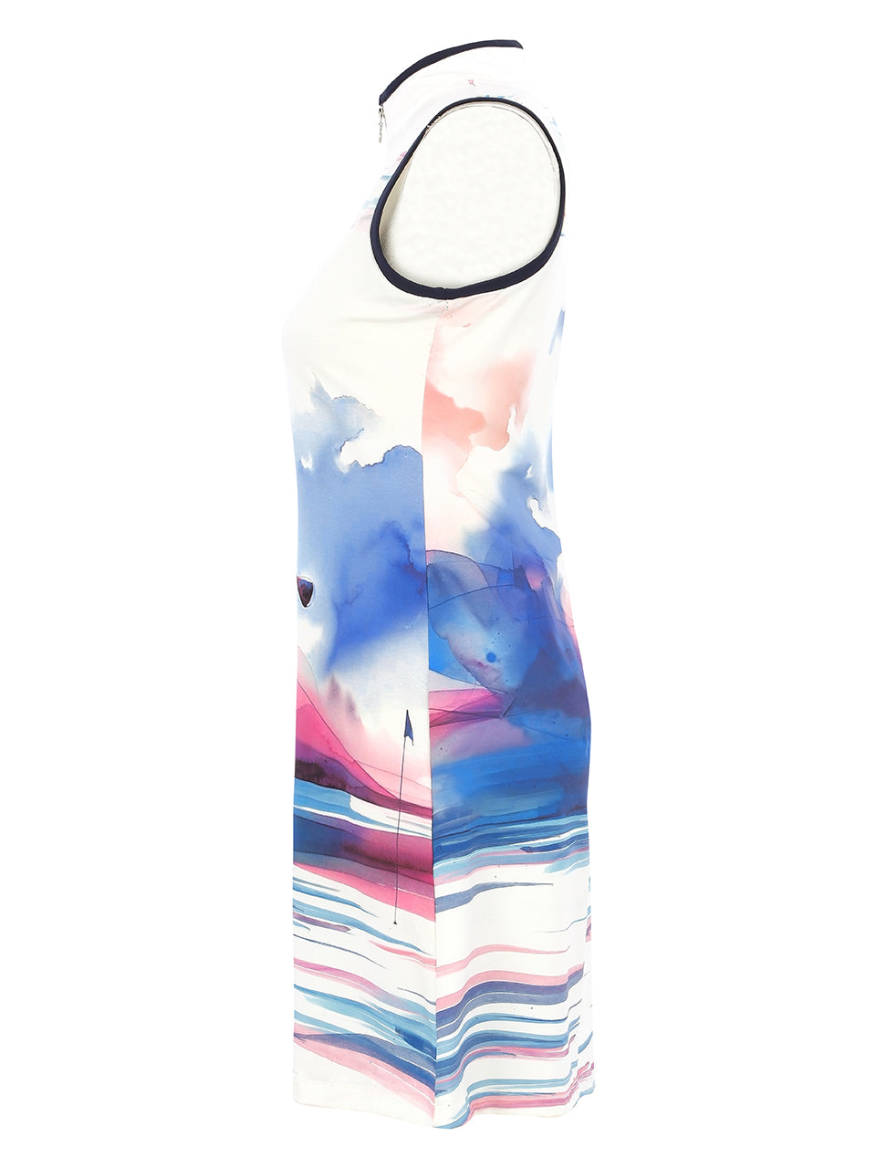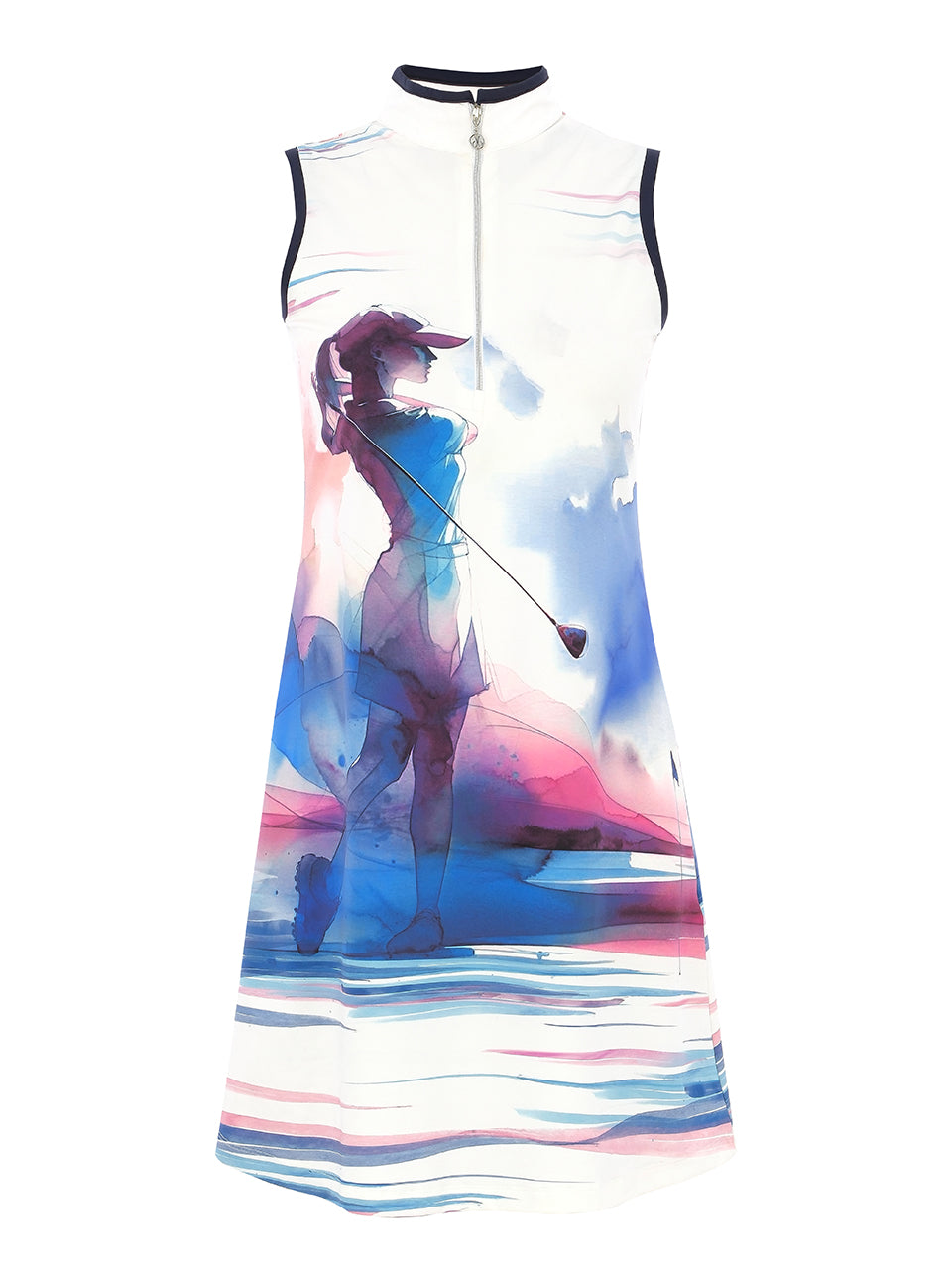 Make a statement on and off the course with this striking golf dress featuring an artistic watercolor print. Designed with a flattering sleeveless silhouette and a sporty zip neckline, it offers both elegance and performance. The lightweight stretch fabric allows for easy movement, while the vibrant golfer-inspired artwork adds a modern, expressive touch. Perfect for sunny days on the fairway or relaxed clubhouse style.