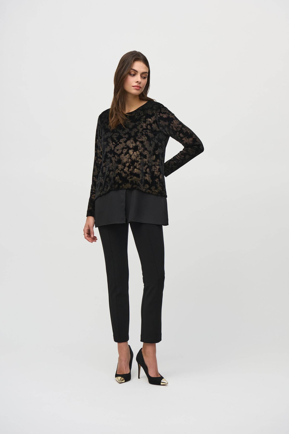 Admirez ce top unique en son genre, confectionné en velours doré scintillant sur une superposition fluide de georgette. Son encolure ronde, ses manches longues et ses fentes devant et dos lui confèrent un charme irrésistible.
