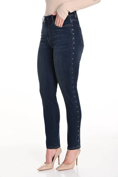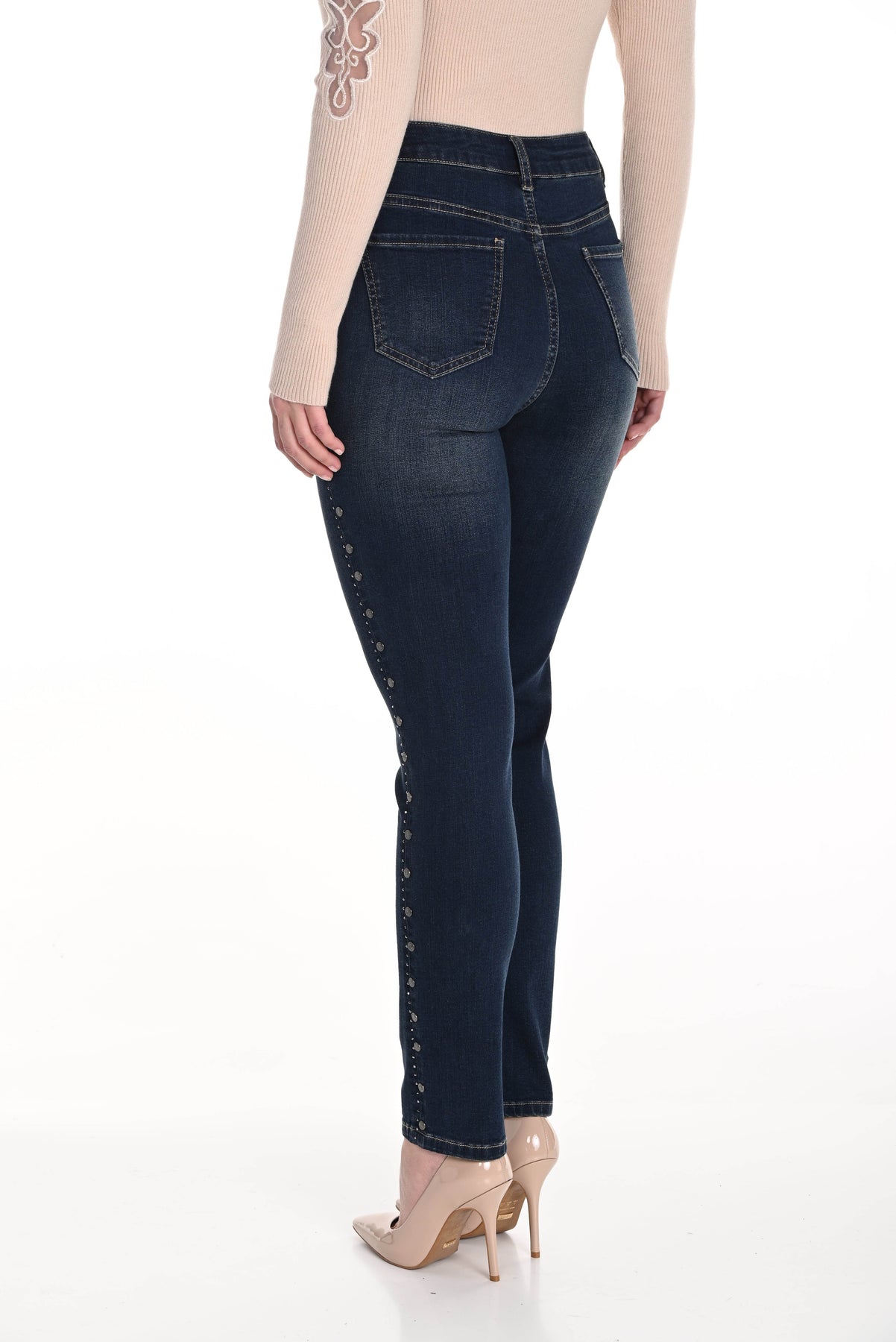 Rehaussez votre garde-robe quotidienne avec ce pantalon en denim bleu foncé Frank Lyman, orné de strass et de boutons en jean pour une touche d'éclat et de sophistication. Alliant confort décontracté et élégance discrète, ce pantalon est idéal en toute occasion.