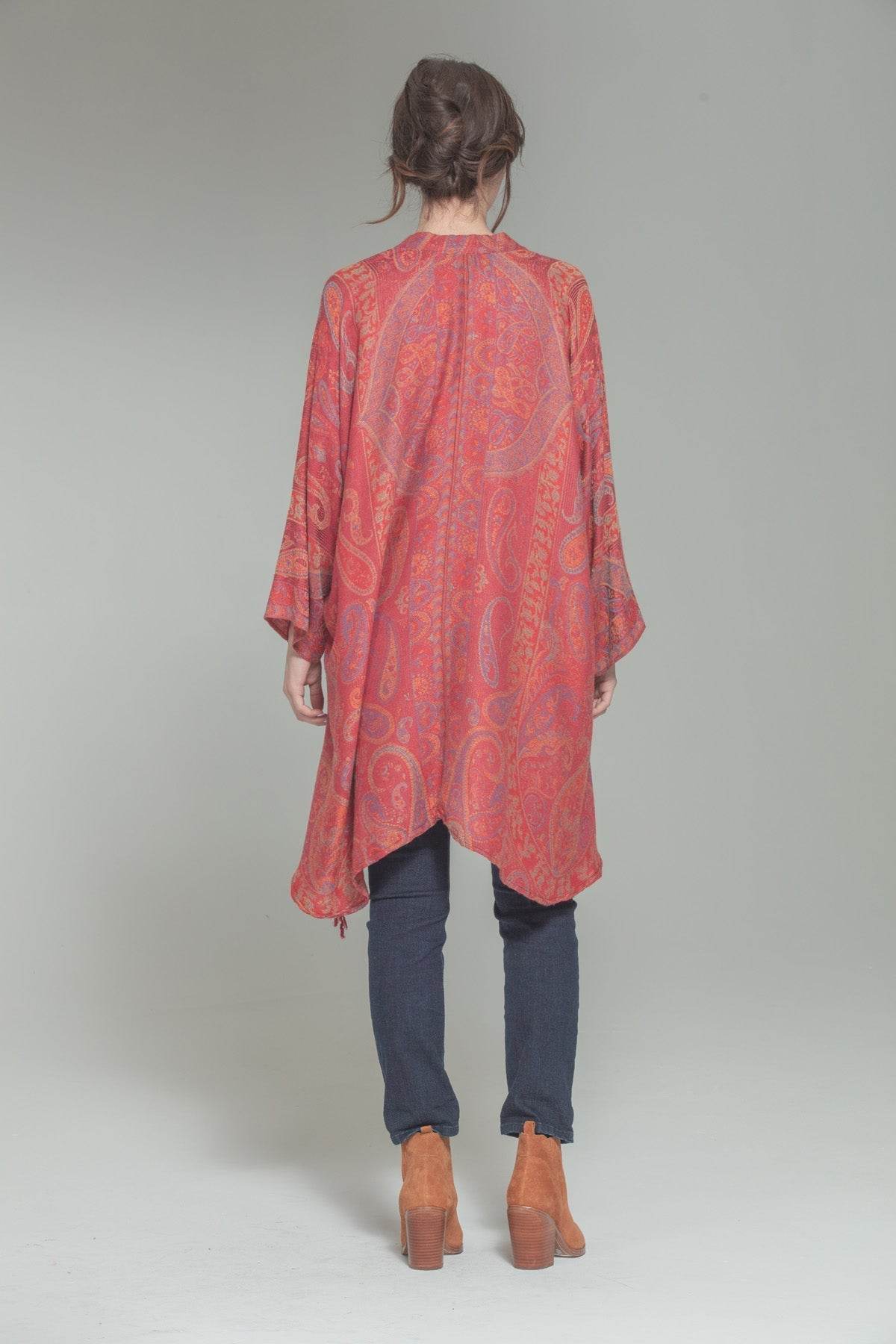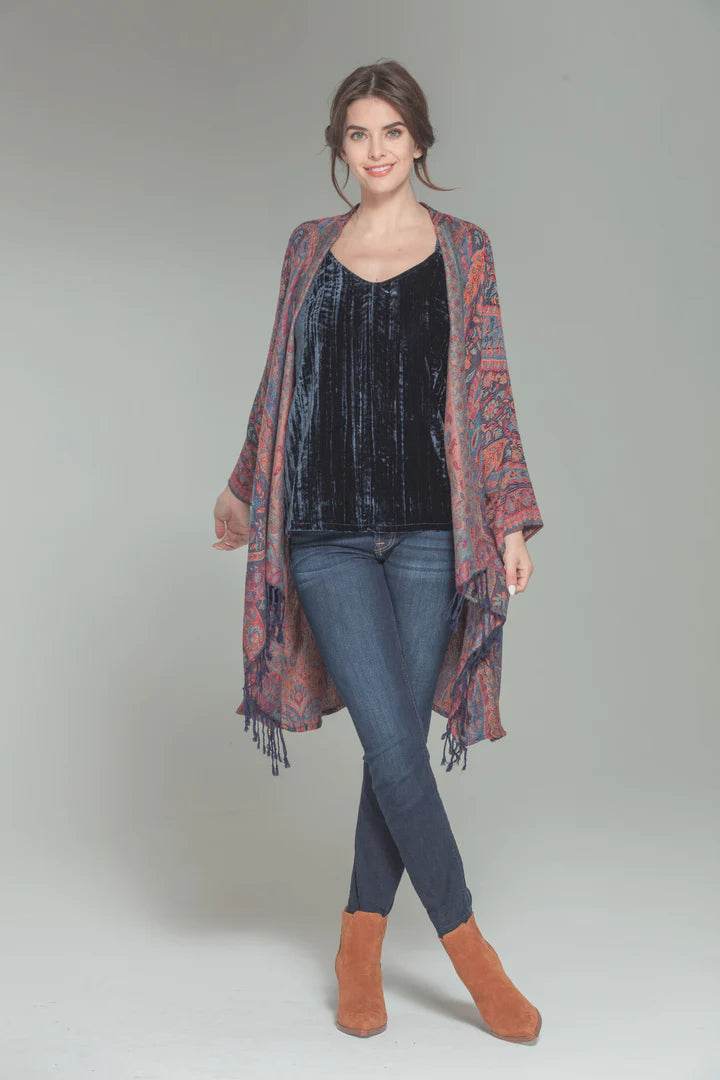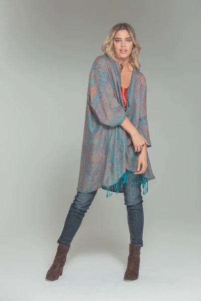 Ce kimono taille unique arbore différents motifs floraux élégants et de magnifiques teintes orange, turquoise et bleu, mêlant imprimés variés. Son tissu léger et aérien complète à merveille toutes les tenues, offrant un look tendance et décontracté pour les mois les plus froids.