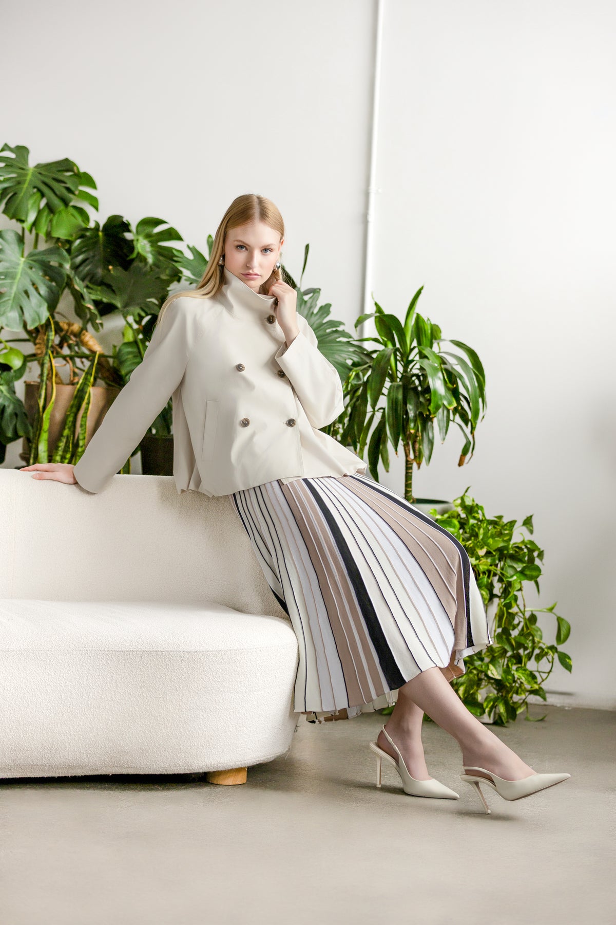 Chic and effortless, this midi skirt features a flattering pull-on waistband and softly pleated silhouette for graceful movement. The vertical stripe design adds a lengthening effect with modern appeal, making it a versatile choice for office days, brunch dates, or elevated everyday styling.