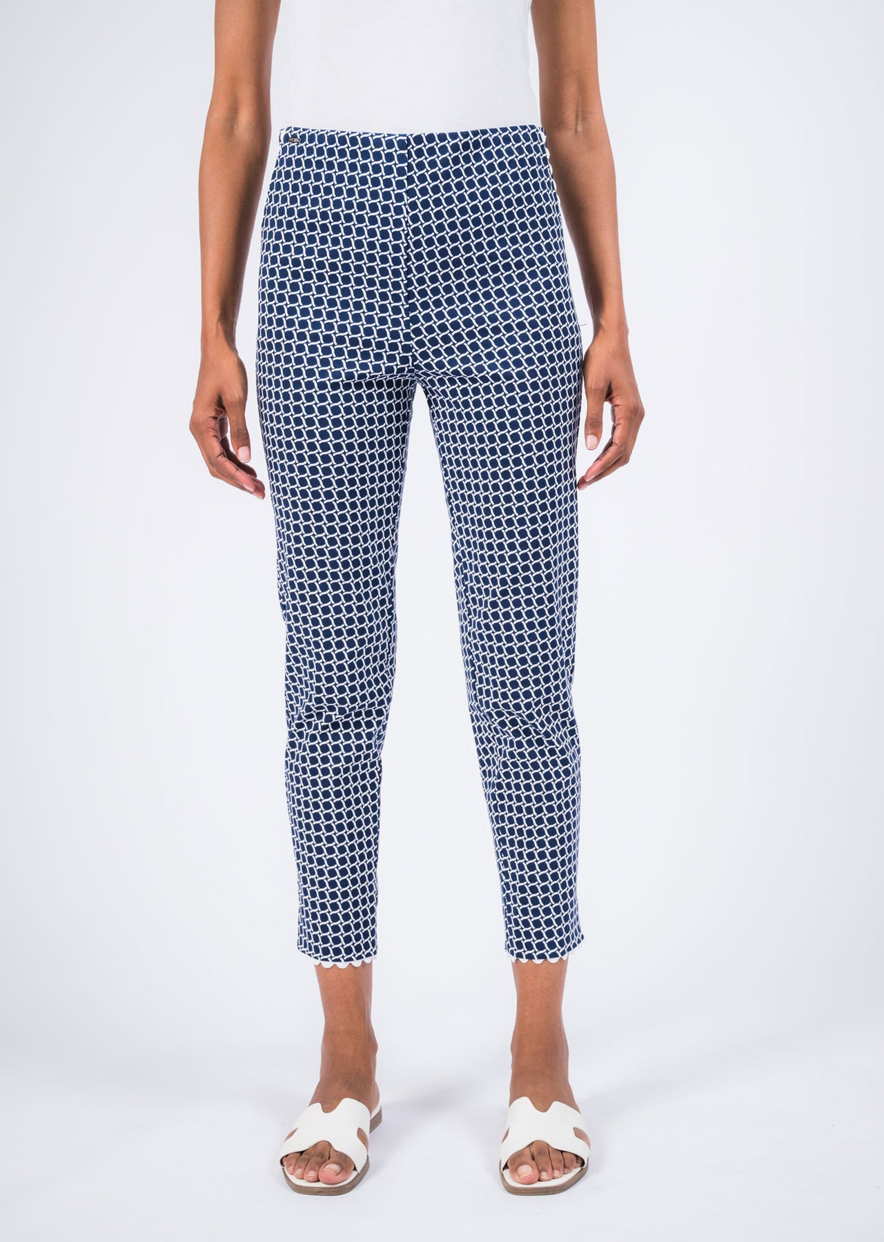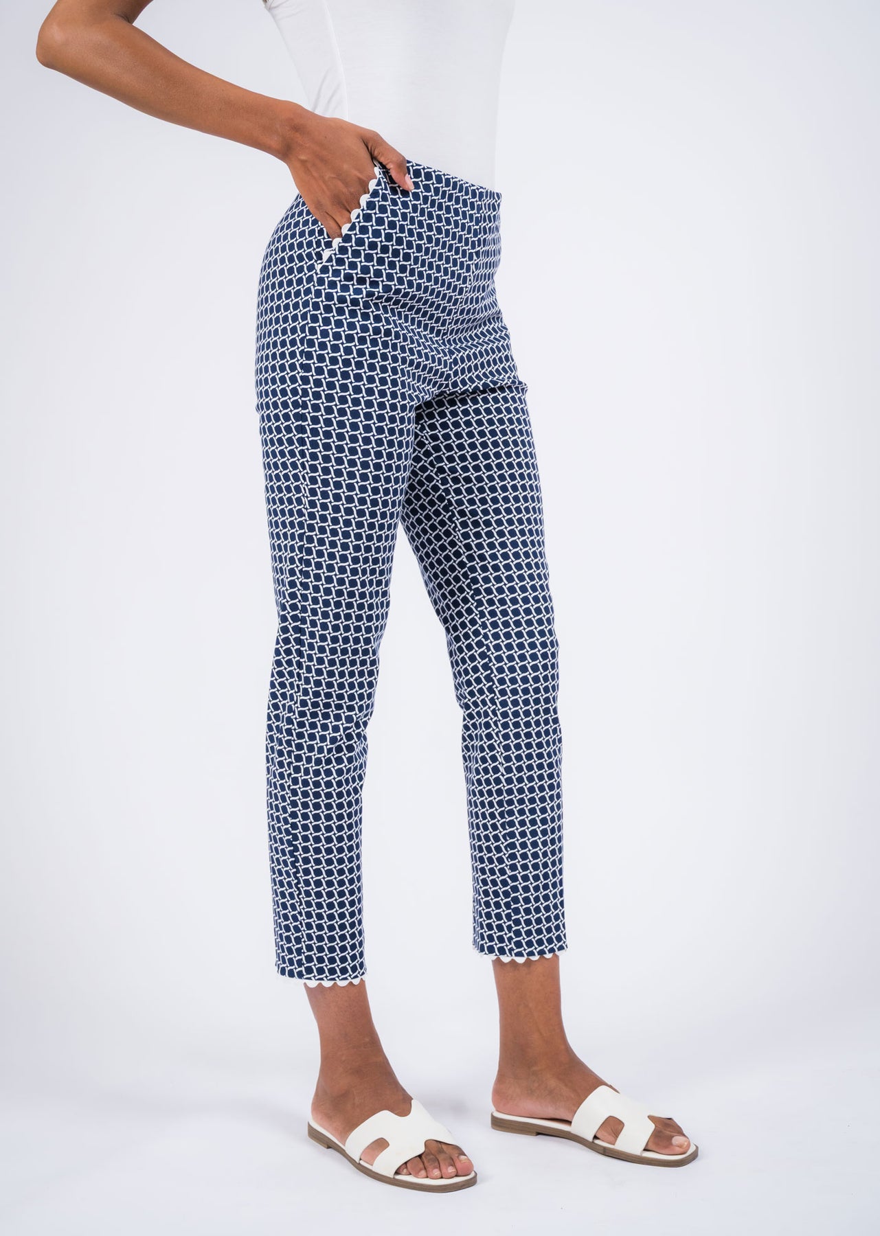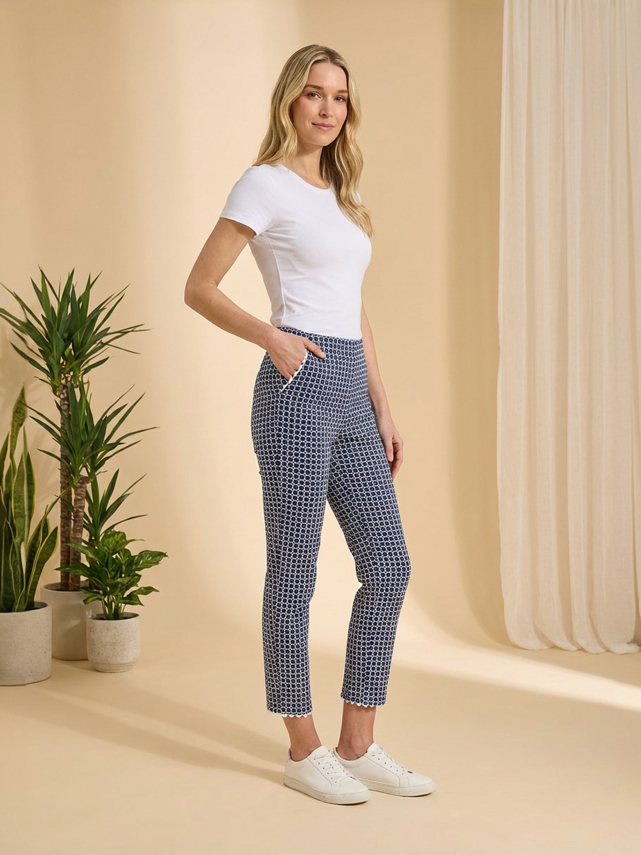 These slim crop pants showcase a cheerful all-over daisy print that adds a fun, feminine touch to your everyday wardrobe. The pull-on waistband creates a smooth, comfortable fit while maintaining a sleek and flattering shape. Designed with a cropped length and finished with a small notch at the hem, they offer a modern detail that enhances both style and movement. Made from stretch fabric for easy comfort, these pants are perfect for warm days, casual outings, or relaxed weekend wear.