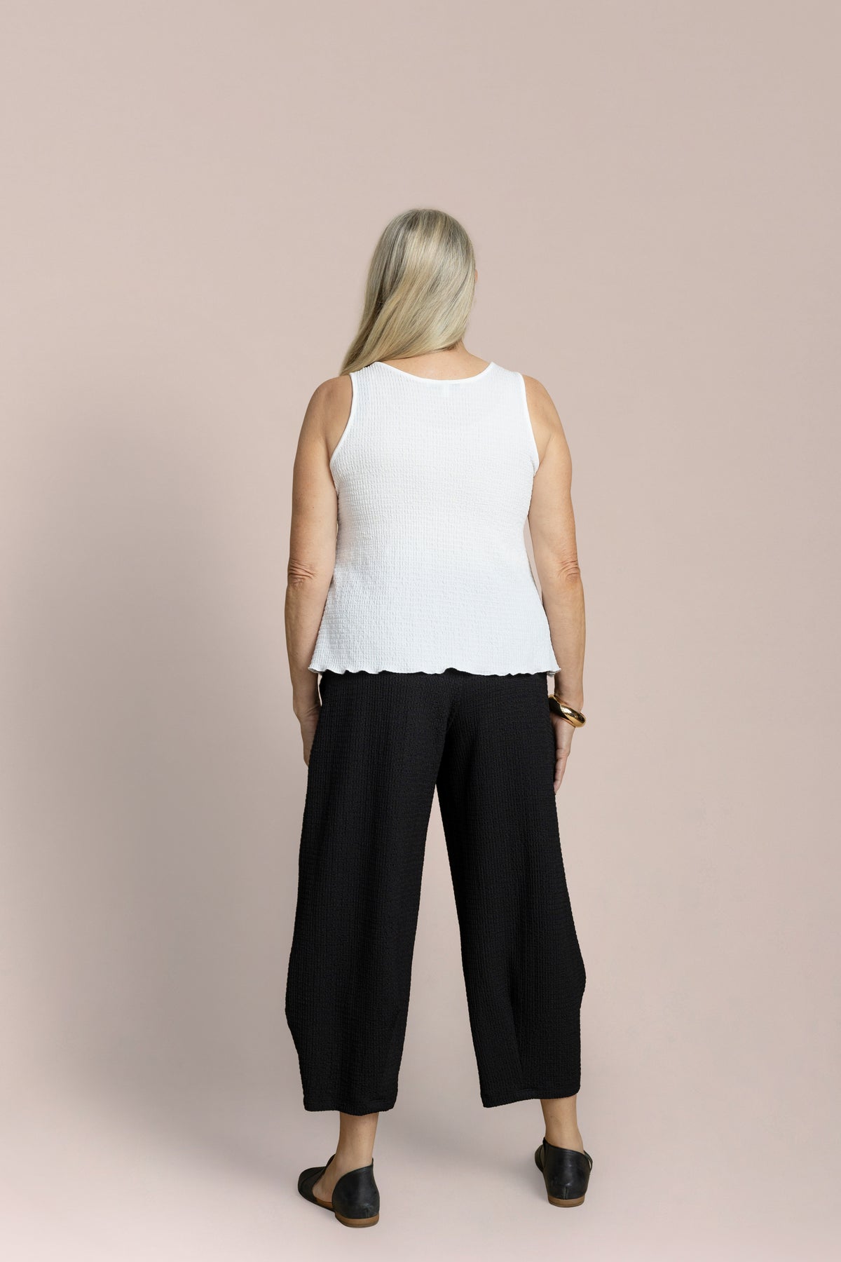 Le top Pop Collage apporte une touche de sophistication naturelle à votre garde-robe. Confectionné dans un tissu texturé et léger, il présente des coutures nettes qui créent un design à la fois saisissant et minimaliste. Confortable, polyvalent et intemporel, ce top vous accompagne avec élégance du bureau au week-end.