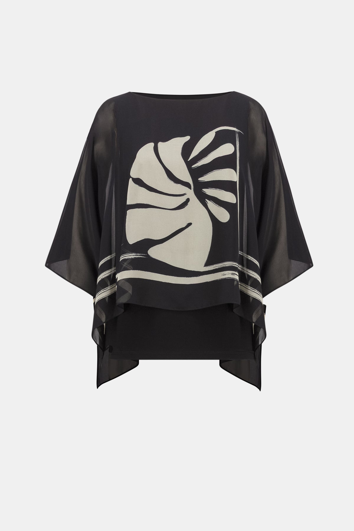 Ce poncho en maille texturée arbore un imprimé tropical d'une élégance aérienne. Doté d'une encolure bateau et de manches trois-quarts dolman, il est parfaitement équilibré par un débardeur en maille soyeuse porté en dessous pour plus de confort.