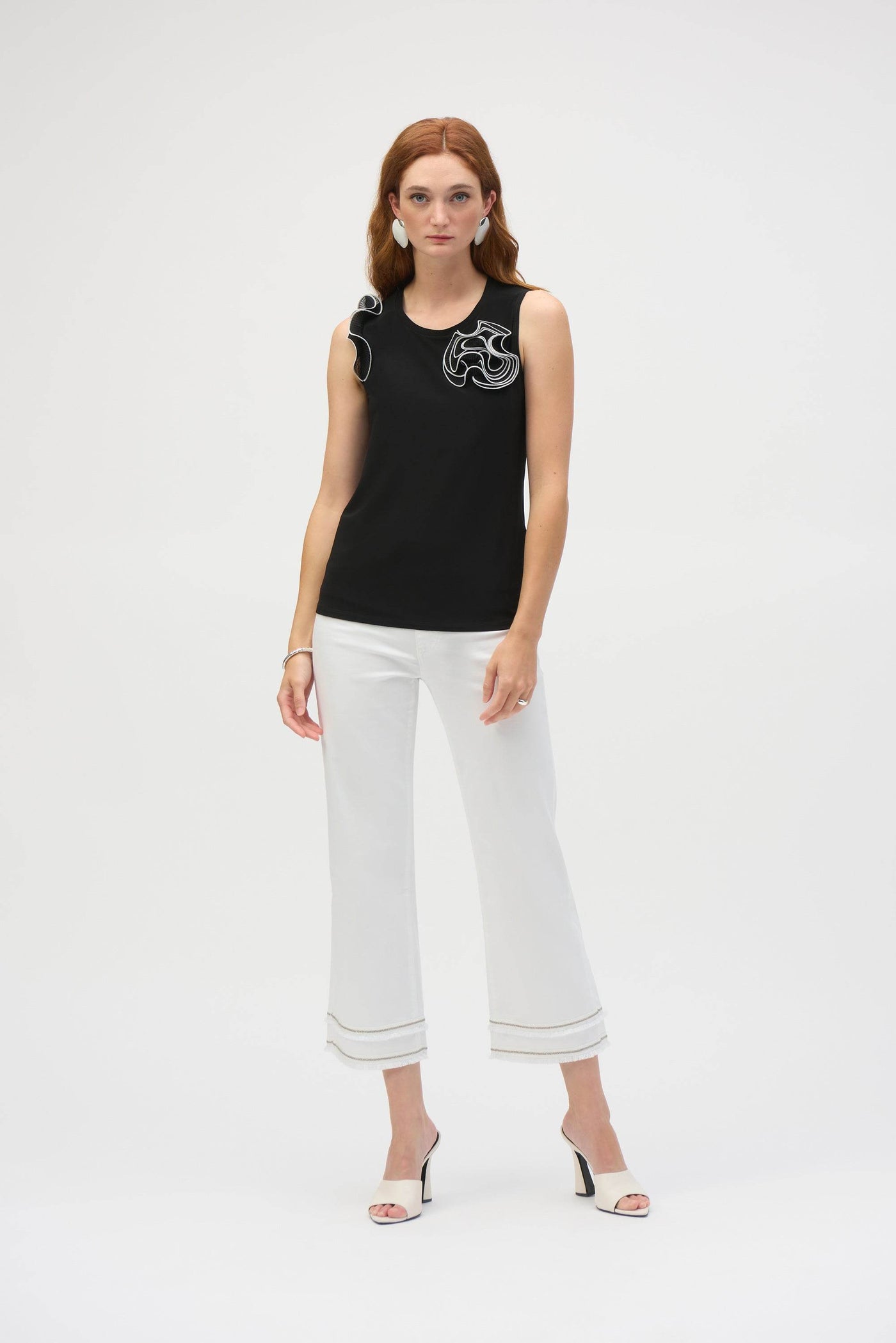 Affirmez votre style avec notre superbe top sans manches, confectionné dans un mélange harmonieux de maille soyeuse et de mousseline, pour une élégance et une texture incomparables. Son col rond est orné de délicats volants appliqués et d'une fleur plissée, tandis qu'une bande plissée à volants ludique sur l'emmanchure droite apporte une touche d'asymétrie fantaisiste. Agrémenté d'un liseré contrastant vibrant, ce top ajusté est une pièce remarquable qui rayonne d'une grâce raffinée.