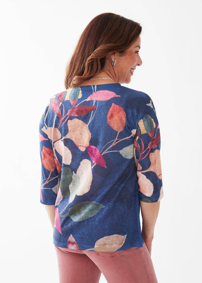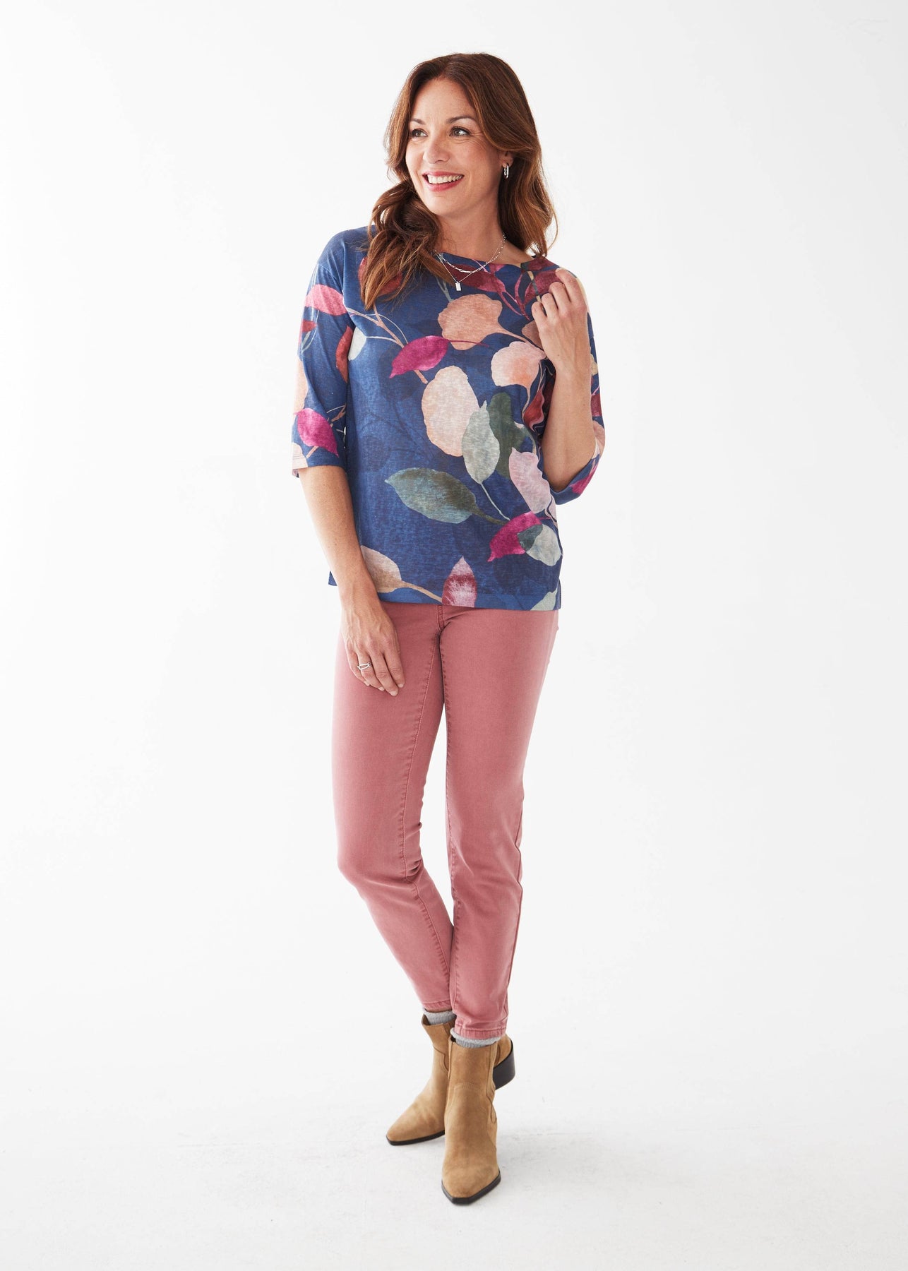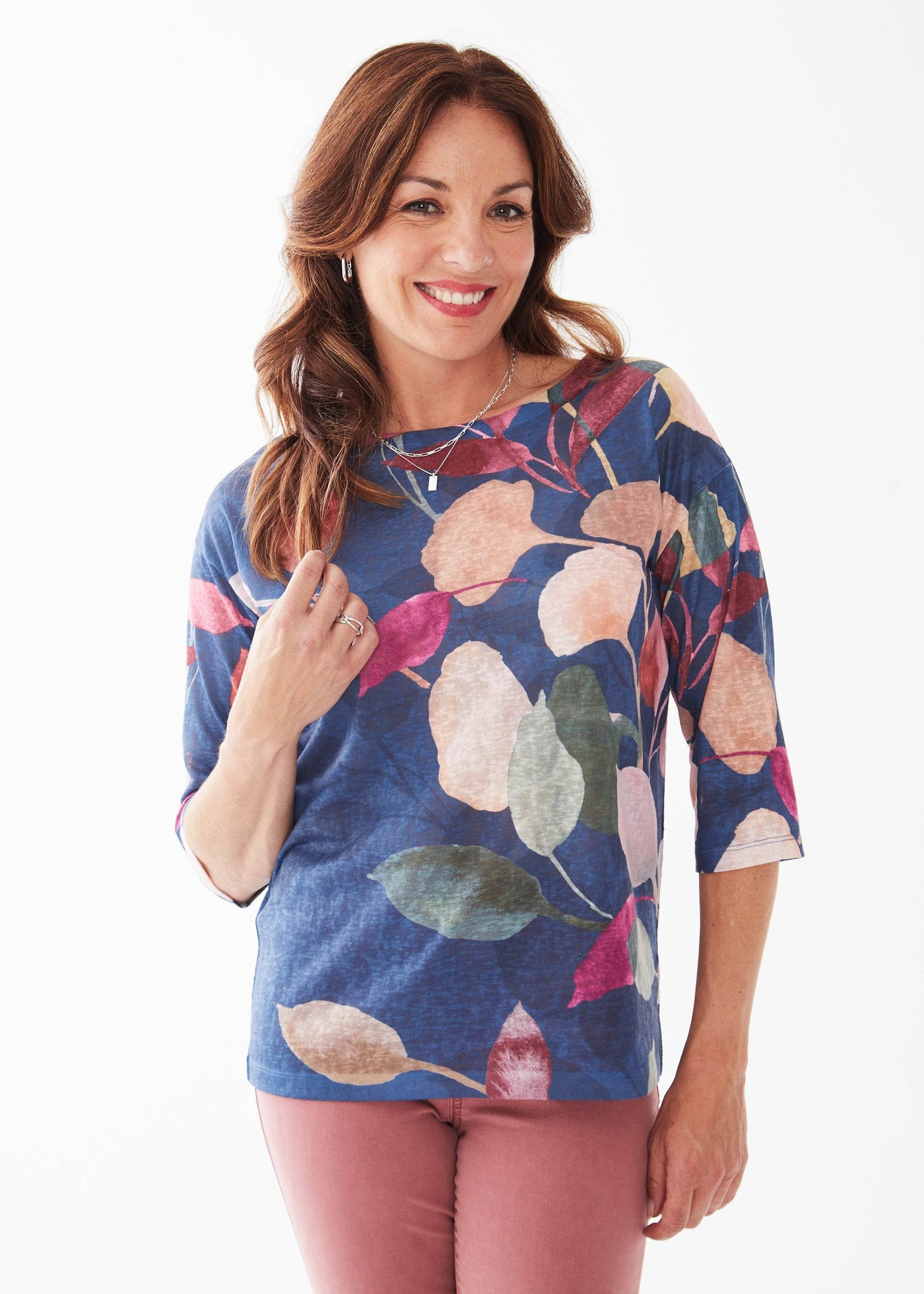 This round neck 3/4 Sleeve Top in Smooth Printed Jersey is the perfect addition to any wardrobe. Its lightweight, printed jersey material makes it comfortable to wear all day while the classic round neck silhouette allows you to style it up or dress it down. Perfect for any season and any occasion, you'll stand out in any crowd with this fashionable top.