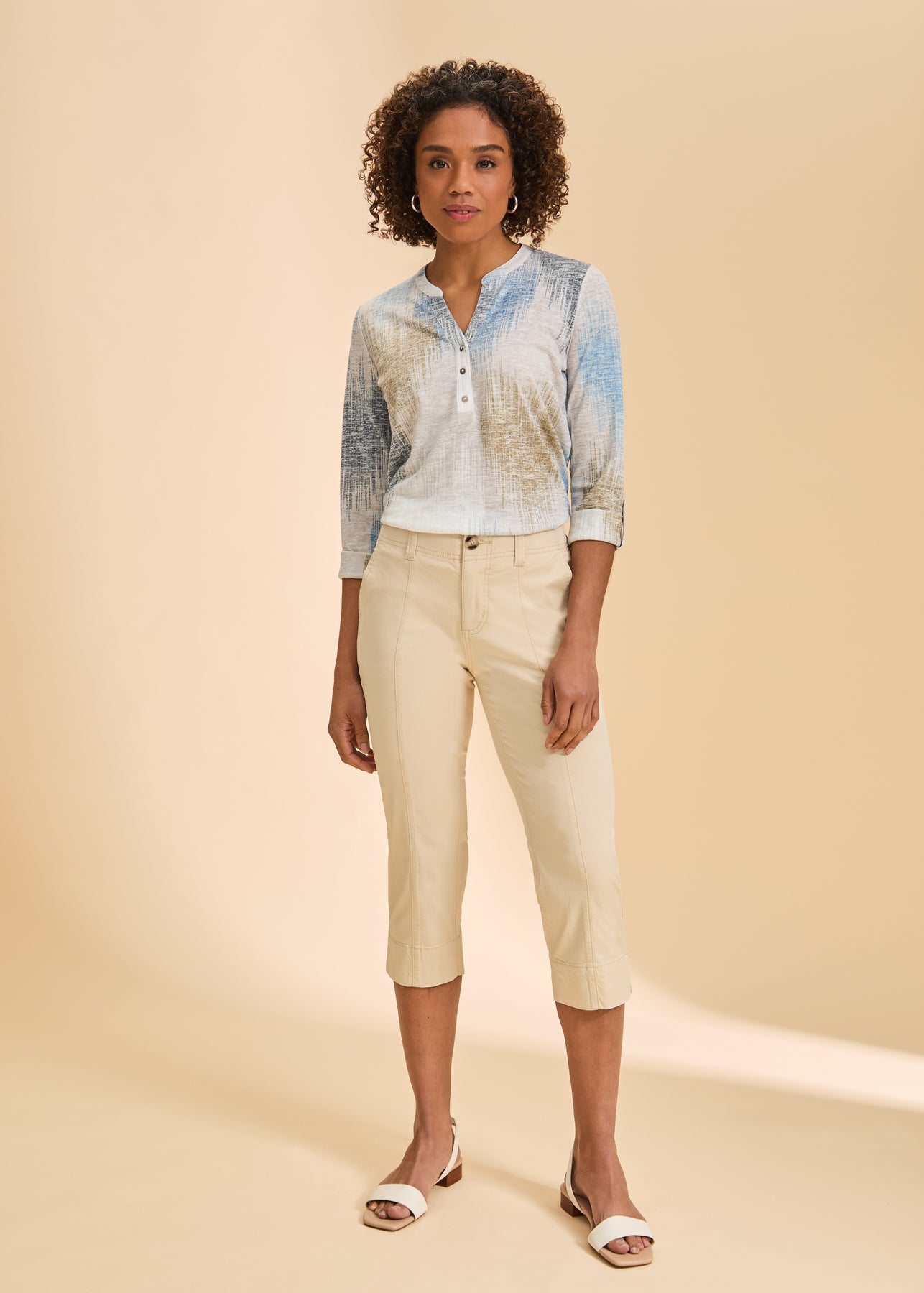 A versatile Henley top that combines comfort with contemporary style. Featuring a brushstroke design in neutral and blue tones, the notched neckline and roll-tab sleeves deliver effortless sophistication. The lightweight knit fabric moves with you throughout your day, making it the perfect layering piece or standalone essential for casual and refined looks alike.