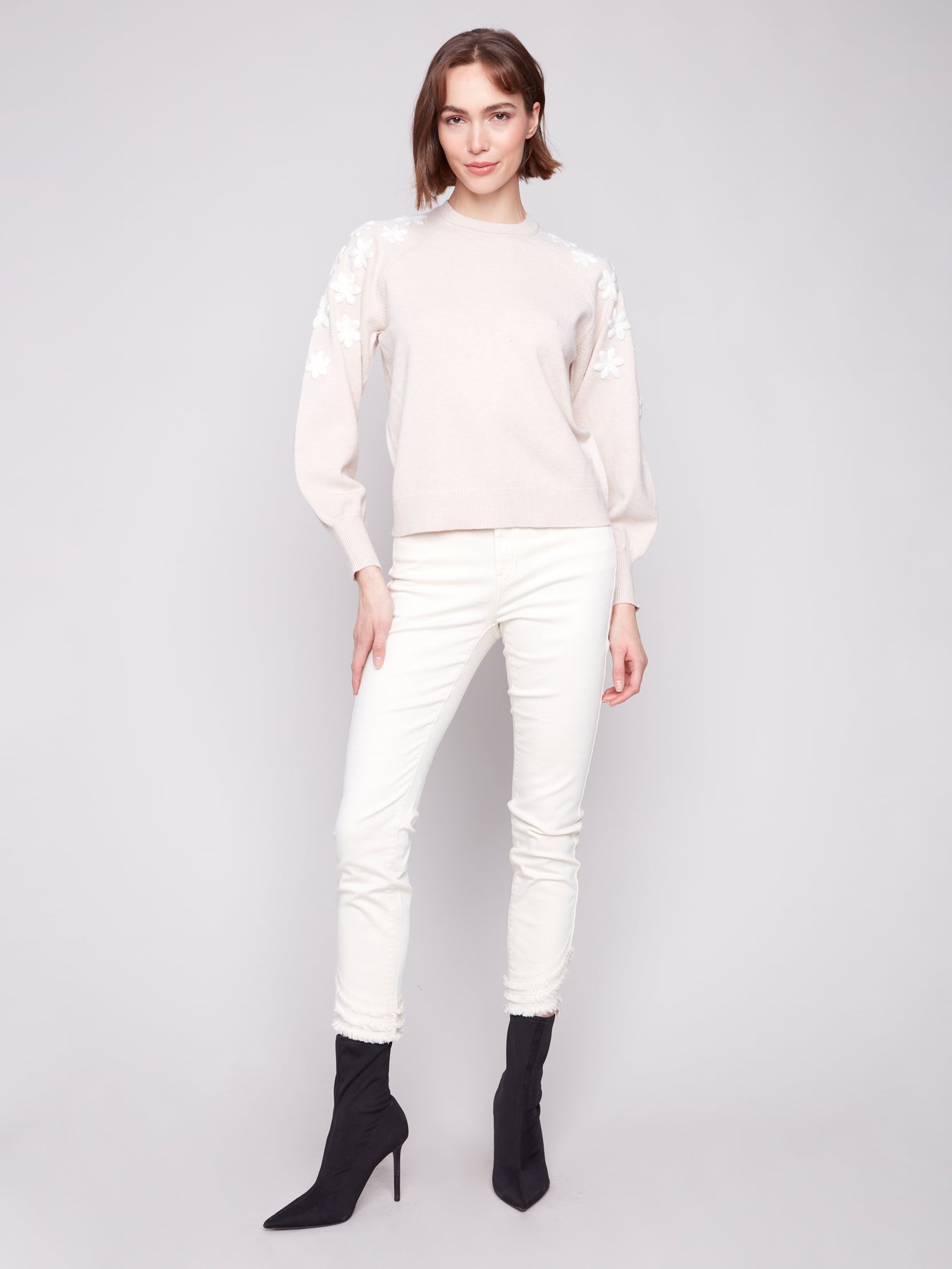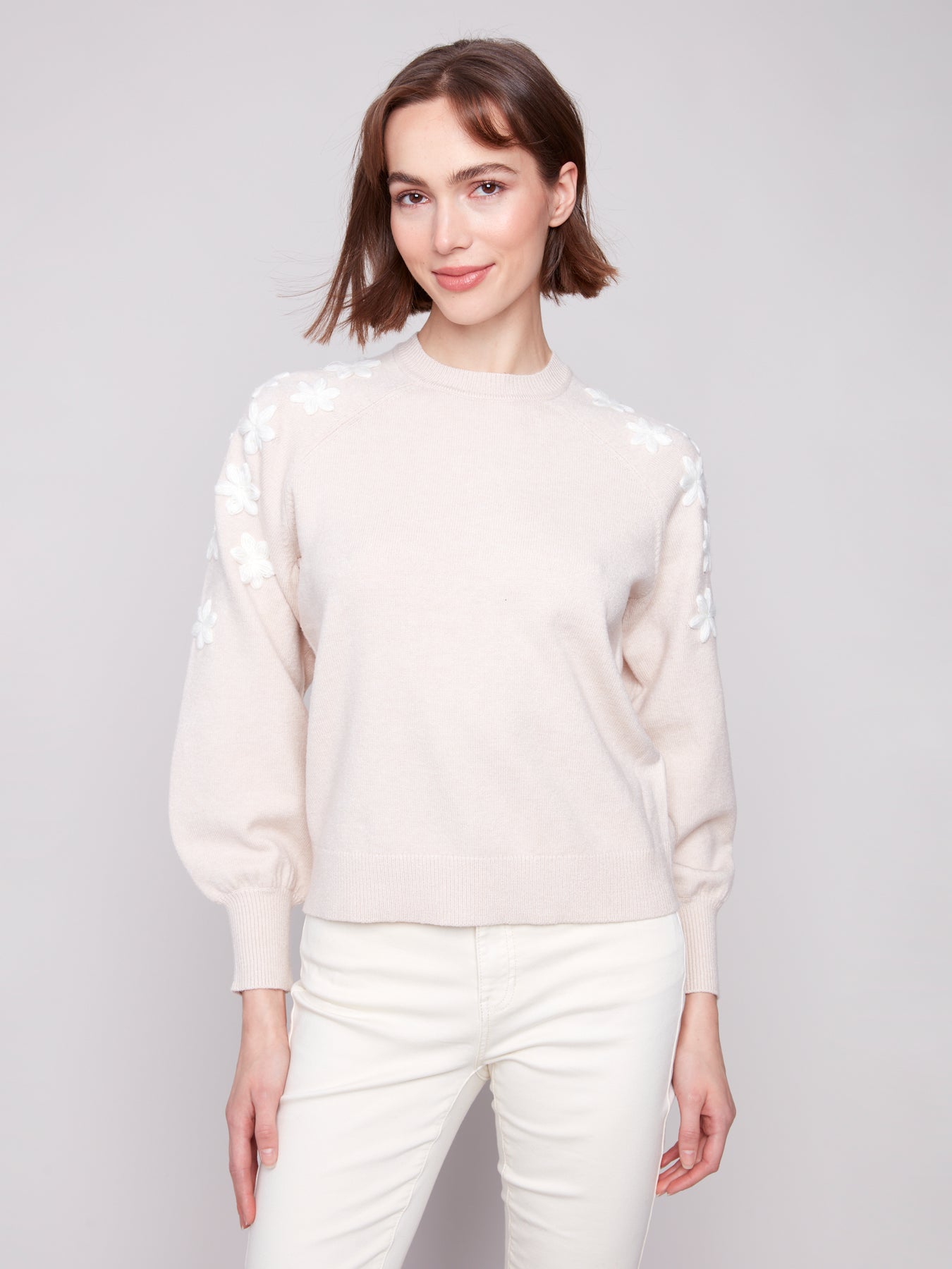 This crew neck sweater combines classic comfort with delicate feminine details. Featuring raglan puff sleeves, it adds a subtle, flattering volume to your silhouette. Intricate embroidered flowers adorn the shoulder, bringing a touch of elegance and artistry to your everyday look. Made from soft, cozy fabric, this sweater is perfect for layering or wearing on its own, keeping you both stylish and comfortable throughout the day. Elevate your wardrobe with this charming piece that effortlessly blends timeless design with unique embroidered accents.
