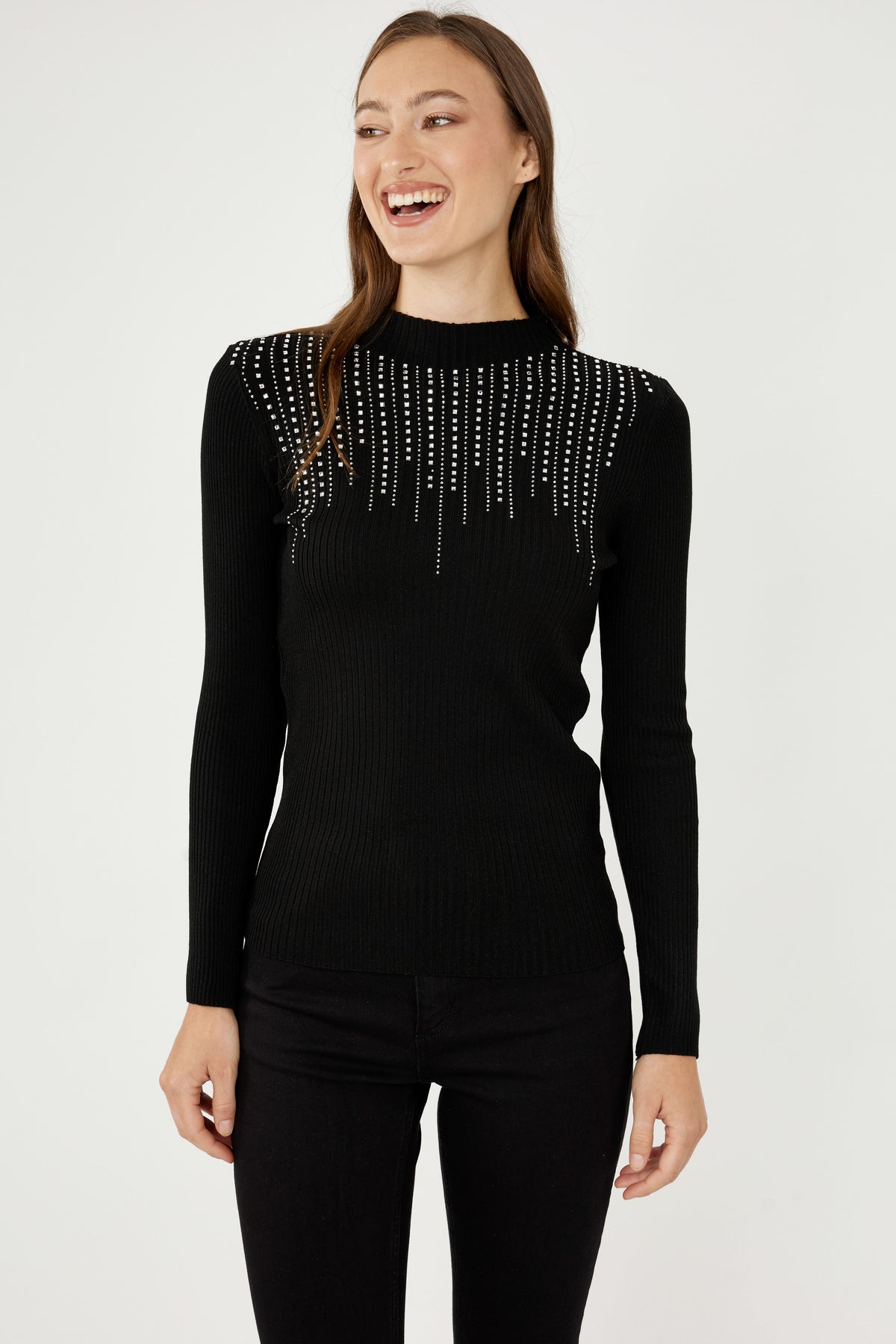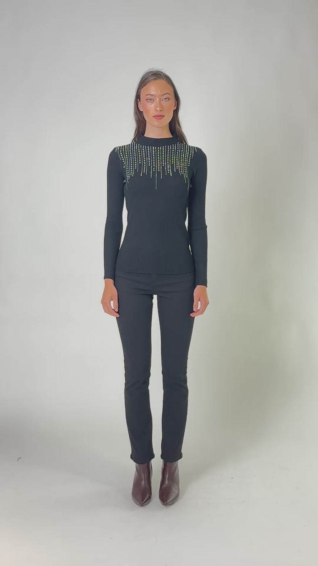 Make a statement with this sleek knit top featuring cascading crystal fringe across the neckline. Designed with a fitted silhouette and high neckline, it offers a polished look with eye-catching sparkle. Perfect for elevating evening outfits or adding glamour to a simple pair of pants. ✨