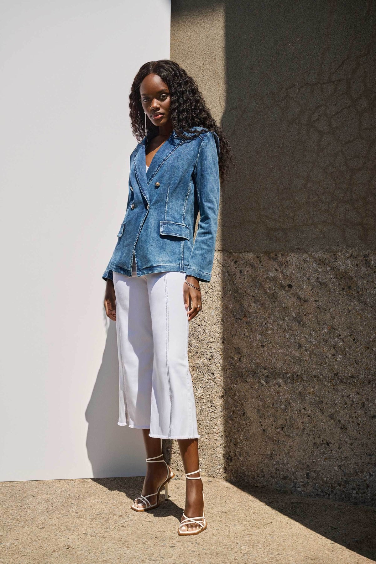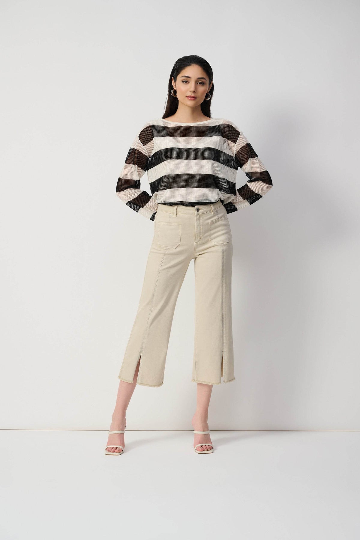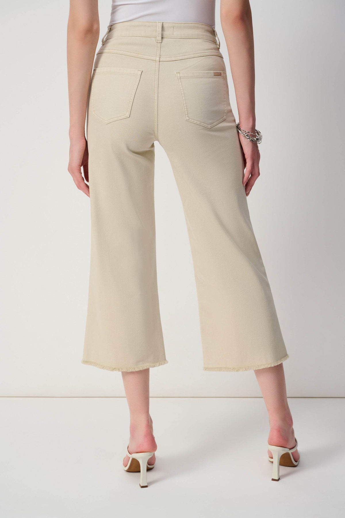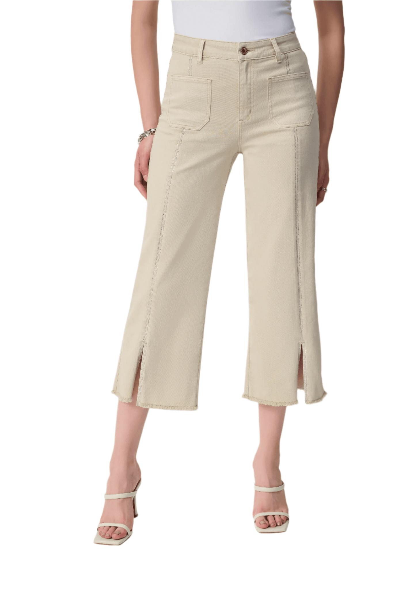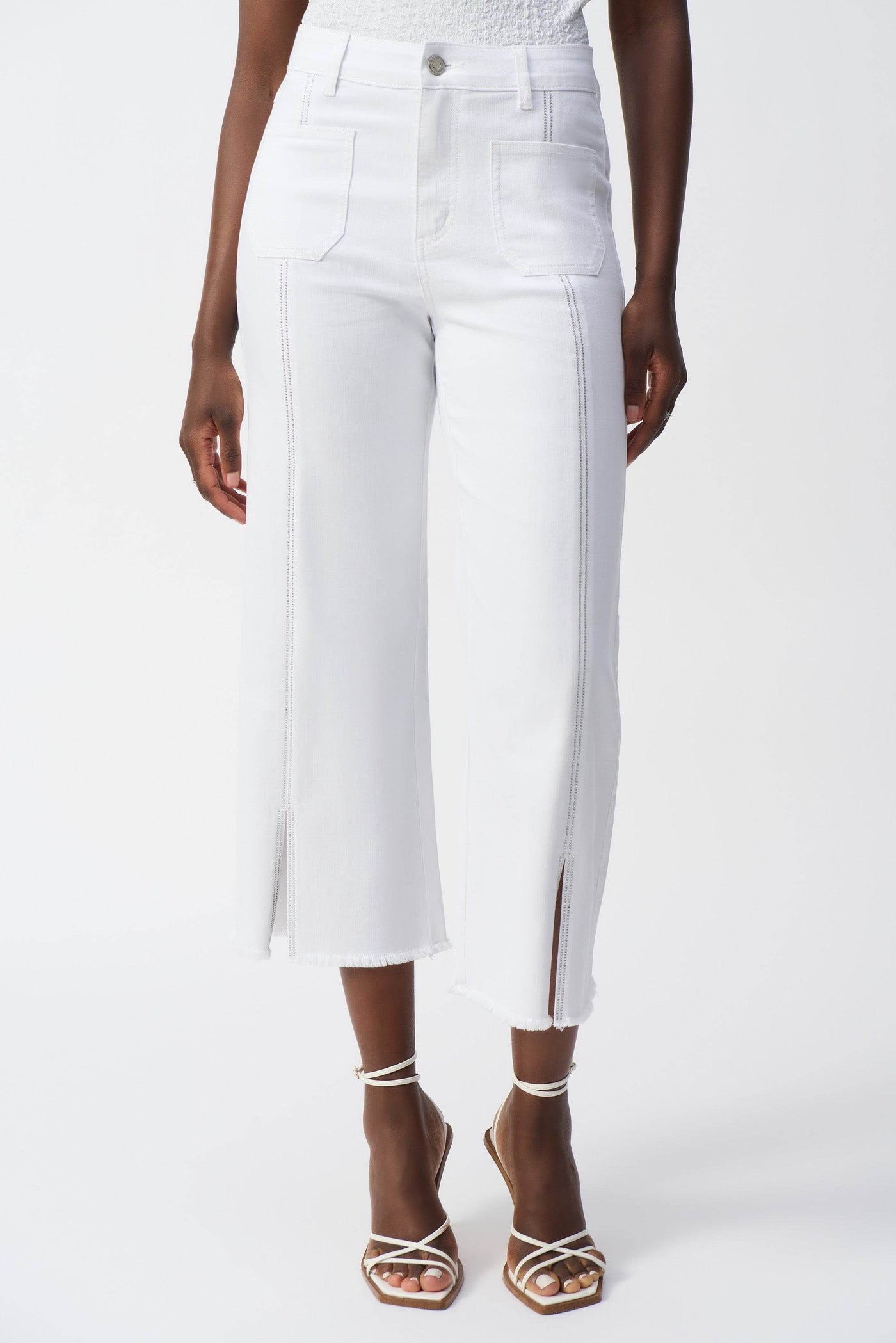 Update your closet with these stunning culotte jeans. These fashionable pants include four functional pockets and a front seam adorned with embellishments, exuding a sense of refinement. The split and frayed hem give the design a fashionable twist, establishing these bottoms as a must-have item.