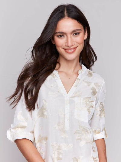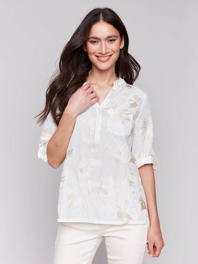 Get ready for compliments with this effortlessly chic blouse! Made from soft, lightweight cotton voile, it'll be your go-to piece for comfort and style. Perfect for any occasion, this blouse features a trendy Mao collar and convenient roll-up sleeves. Plus, the half-button design and front pocket add playful details to this must-have wardrobe staple. Elevate your look and feel confident in this beautiful blouse.
