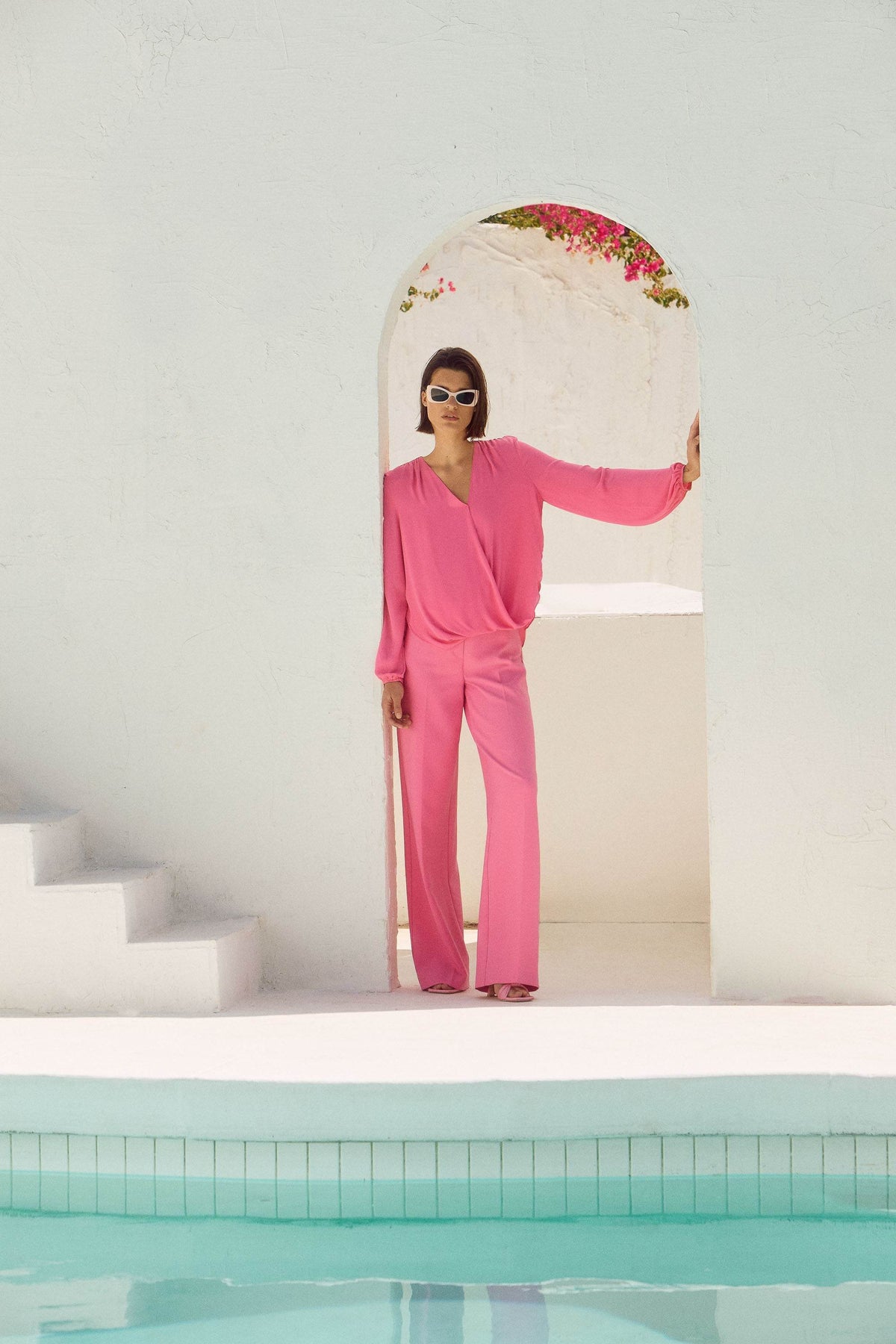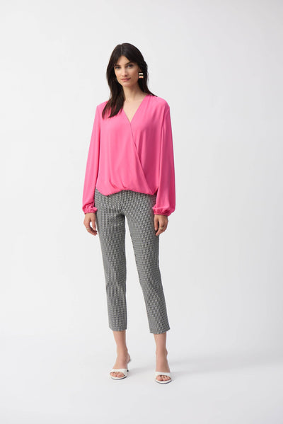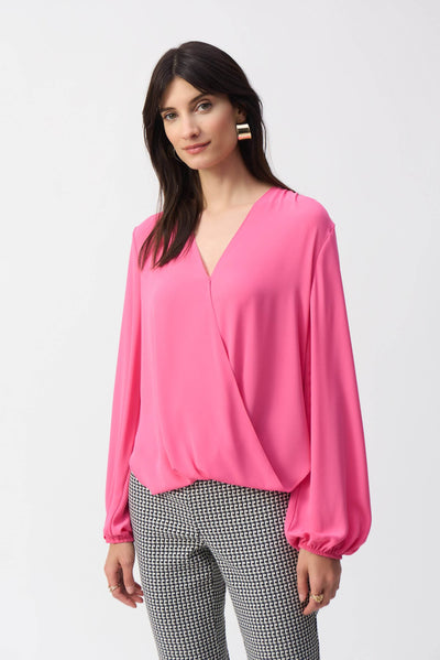 Embrace the pure elegance of this georgette top. The exquisite wrap neckline and high-low hem add character to the garment’s boxy silhouette. The long puff sleeves lend a refined feel to every movement and a timeless appeal to this remarkable piece.
