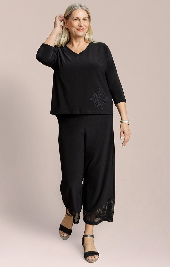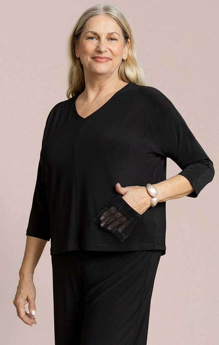 Chic and understated, this relaxed-fit top is designed for effortless sophistication. Crafted from a soft, comfortable knit, it features a flattering V-neckline and three-quarter sleeves for easy, everyday wear. The subtle pocket detailing near the hem provides a hint of texture and interest. Perfect for pairing with matching pants or styling with your go-to bottoms, this versatile piece transitions seamlessly from day to evening.