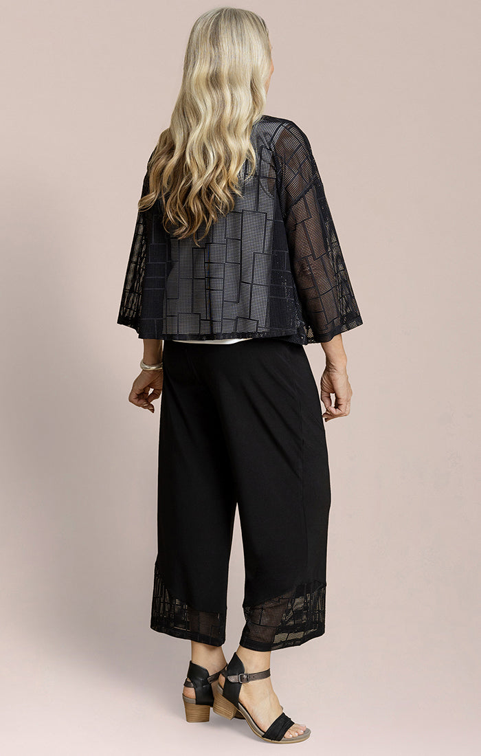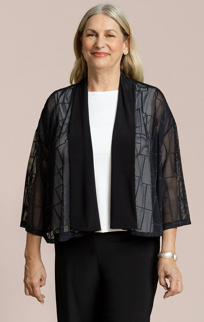 Add a touch of elegance to your look with this lightweight, open-front cardigan. Designed with a soft, flowy silhouette, it features sheer mesh sleeves and a delicate textured finish that brings subtle dimension to any outfit. The relaxed fit drapes beautifully, while the cropped length makes it perfect for layering over both casual and dressy pieces. Effortlessly versatile, this cardigan is an easy way to elevate your everyday style or complete an evening ensemble.