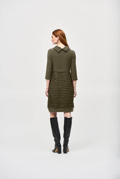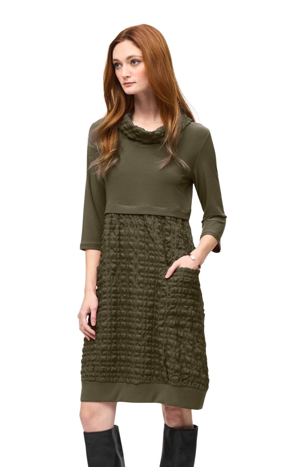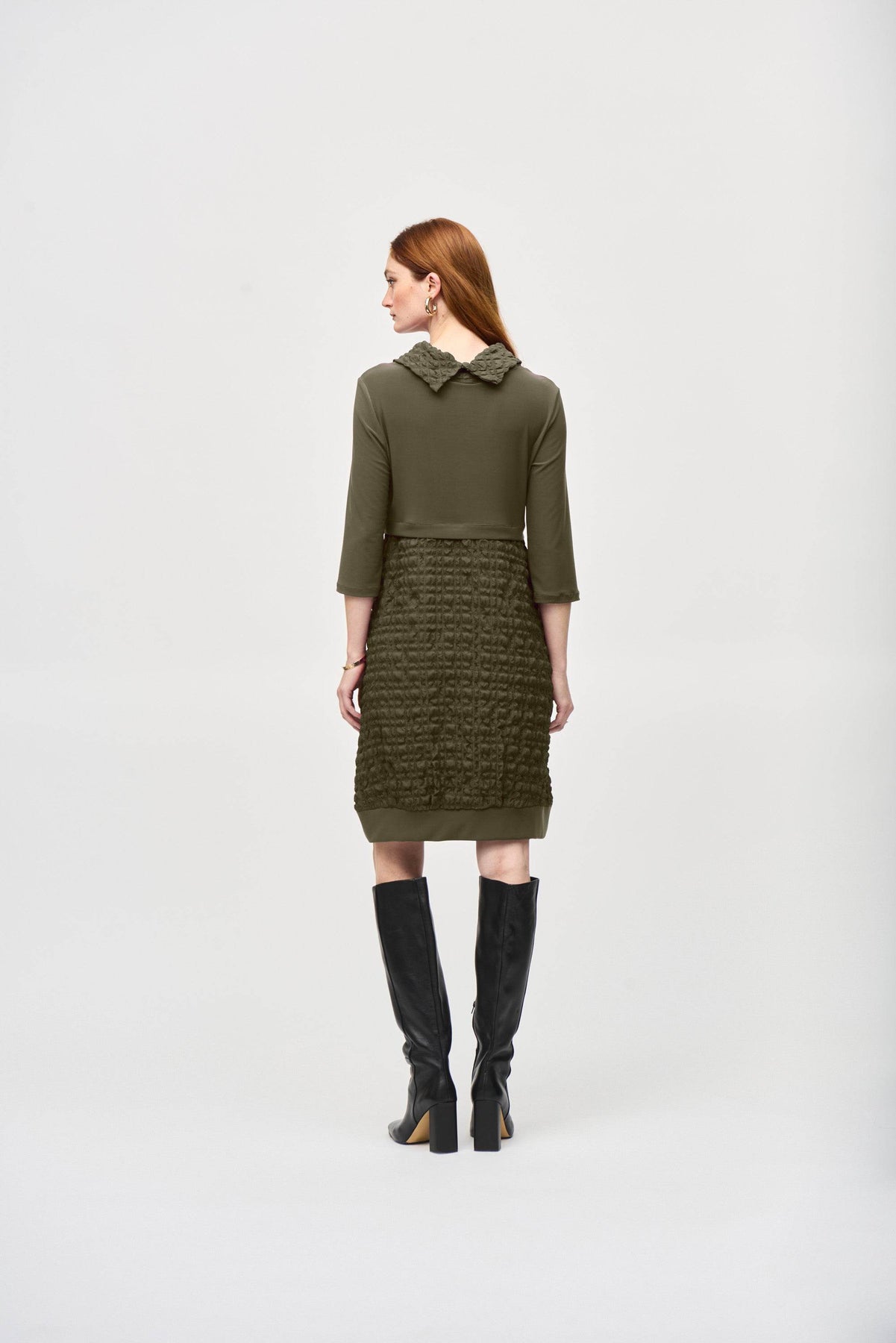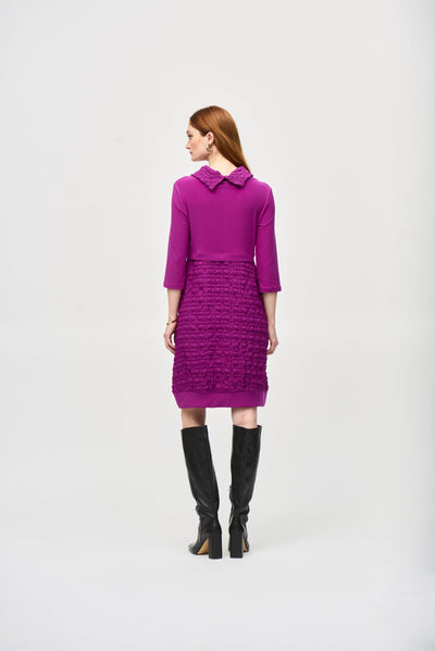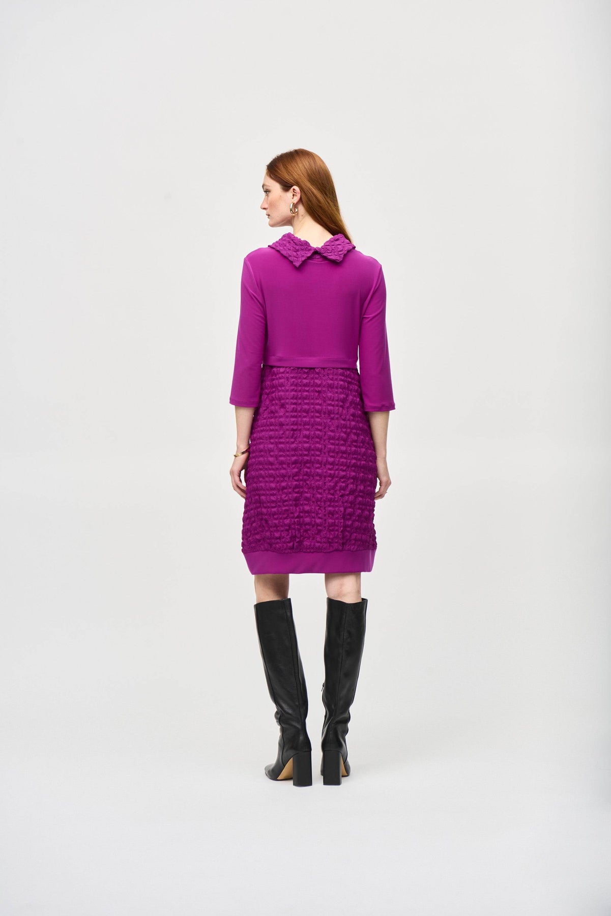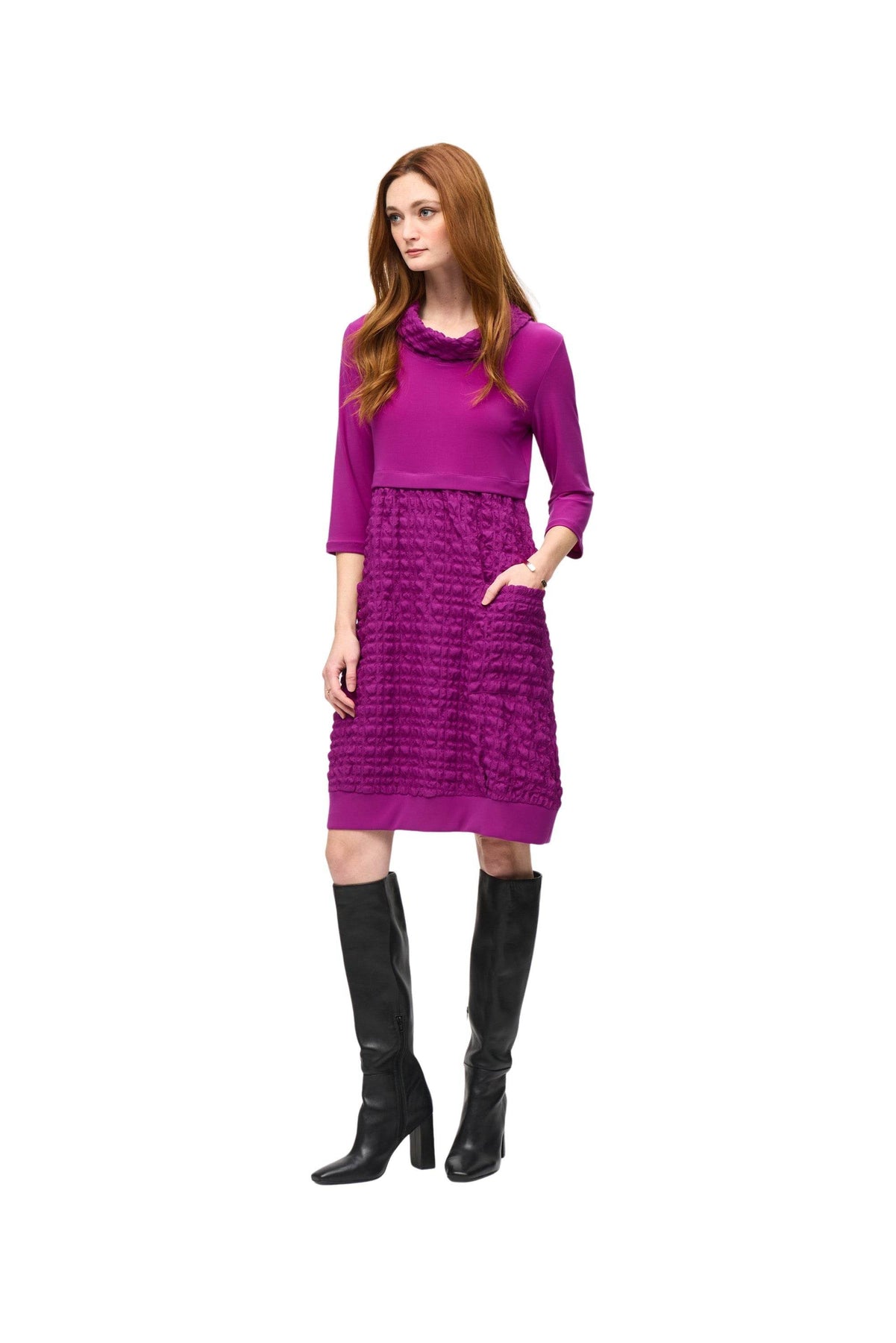 Indulge in the perfect blend of opulence and allure with this stunning bubble jacquard and silky knit cocoon dress. The empire waist features delicate shirring, highlighting the elegant silhouette, while the three-quarter sleeves add a touch of sophistication. Complete with convenient front pockets and an exquisite stand collar, this dress also boasts a beautiful back button opening.