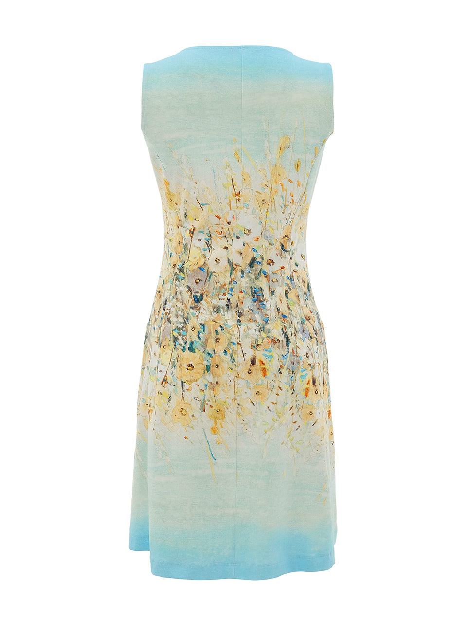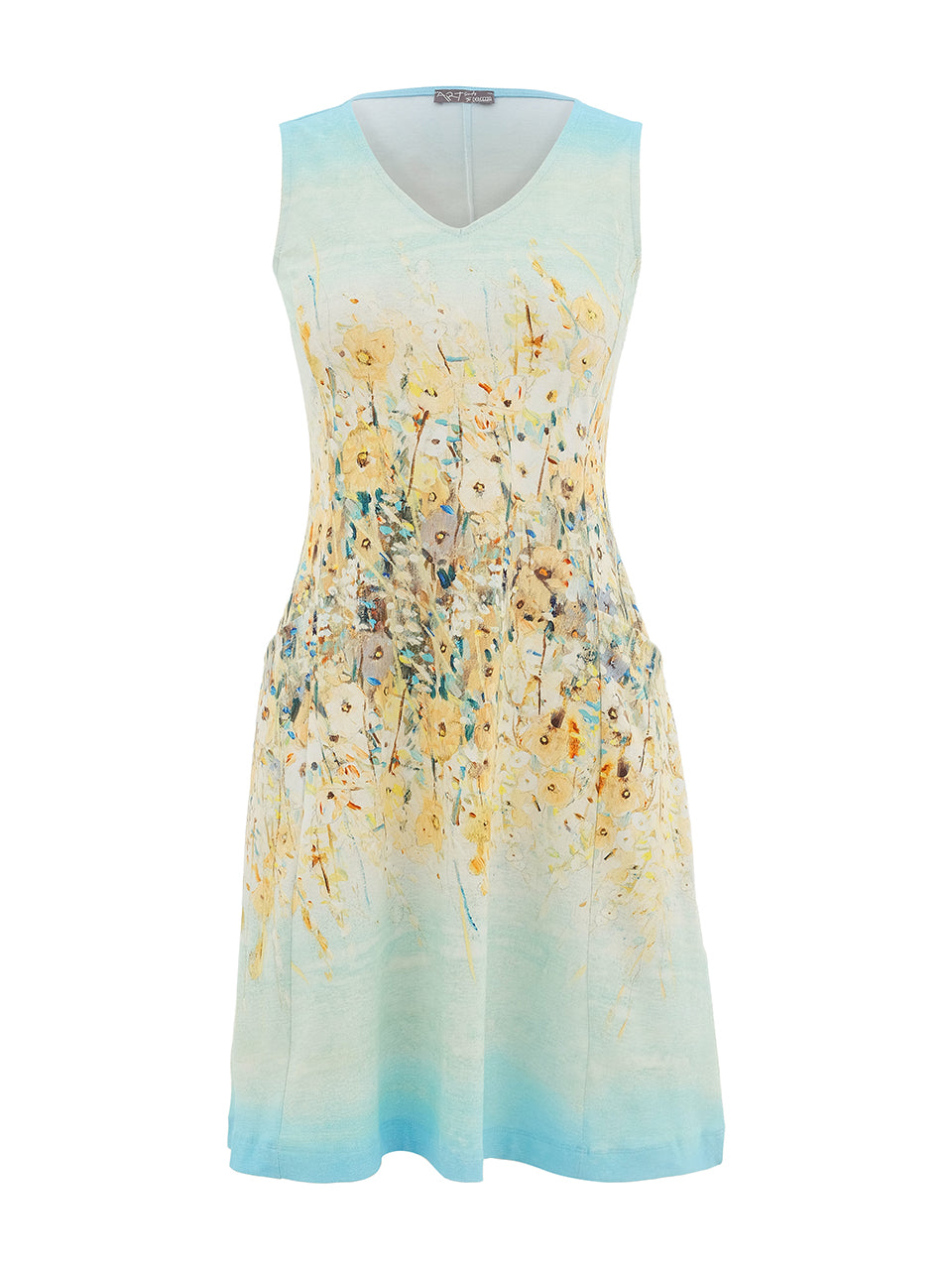 Soft, airy, and effortlessly feminine, this sleeveless V-neck dress features a delicate wildflower-inspired print in warm golden tones set against a serene aqua backdrop. The gently shaped silhouette flatters the waist while offering easy movement and all-day comfort. Crafted in a lightweight, breathable fabric, it’s perfect for sunny days, garden gatherings, or seaside escapes. Fresh and refined, this dress captures the beauty of nature with an elegant artistic touch.
