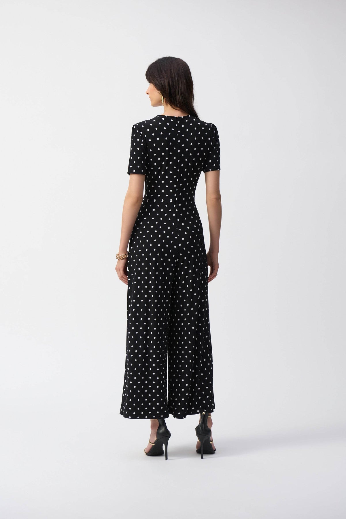 Discover the elegance of this exquisite silky knit jumpsuit. Its culotte silhouette is enhanced by a beautiful dot print, while the wrap bodice delicately envelops the upper body. Short puffed sleeves provide a touch of charm, and a delicate gold ornament on the side adds to the chic and modern design.