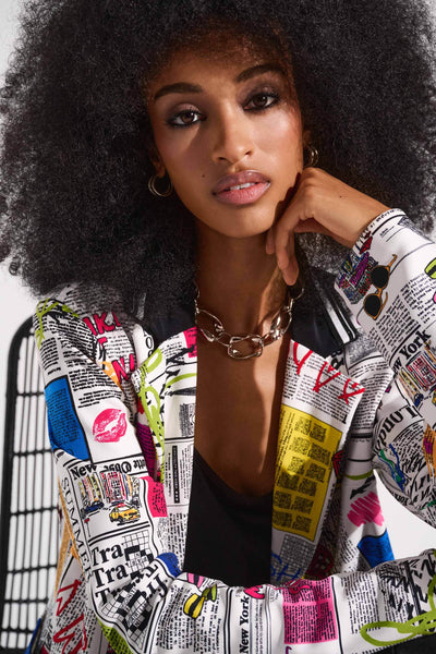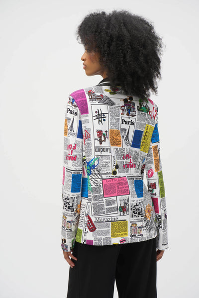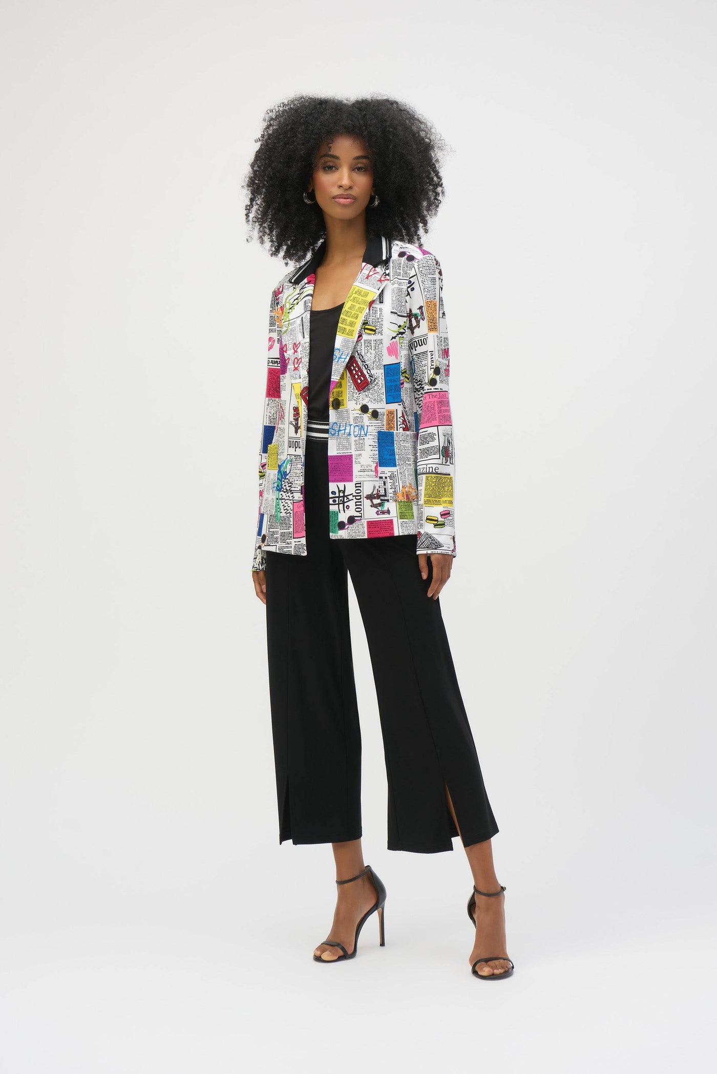 Elevate your look with this chic and stylish Silky Knit Word Print Fitted Blazer. Tailored in a slightly fitted design, it complements any silhouette and features an alluring word print that adds a unique touch. The notched collar, contrasting tape trim, and tiny rhinestone accents make this piece a refined and sophisticated choice.